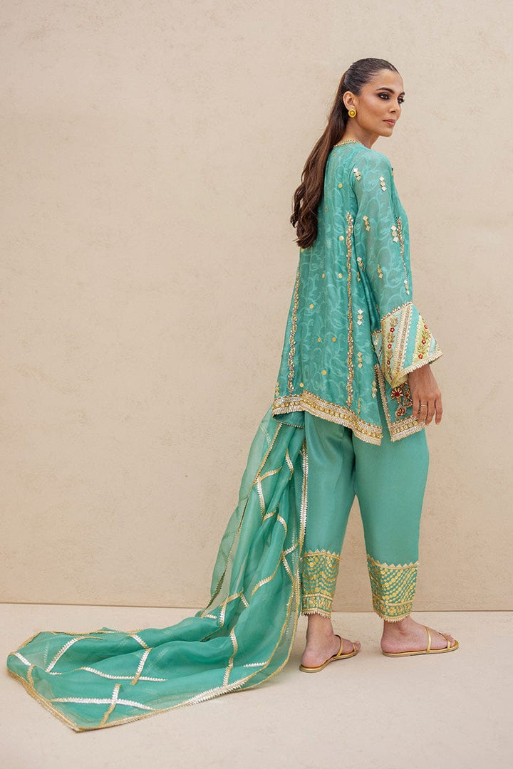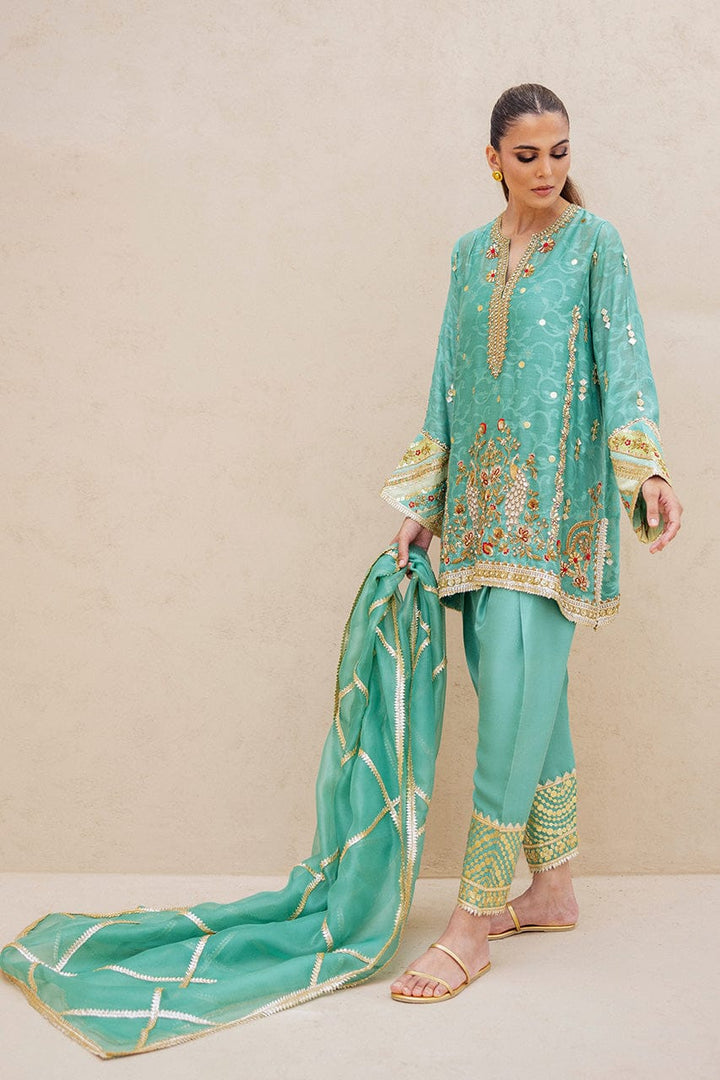 A serene turquoise ensemble shimmering with artisanal finesse. A cotton net short, cut in a timeless straight silhouette, is lavishly embroidered with zardoze, gota, resham and sequins in floral bursts and statement peacocks with diamante encrusted tails. Paired with tailored pure raw silk shalwar featuring intricate gota detailing. The matching airy organza dupatta, adorned with diagonal gota lines and delicate edging, drapes like a whisper of regality.