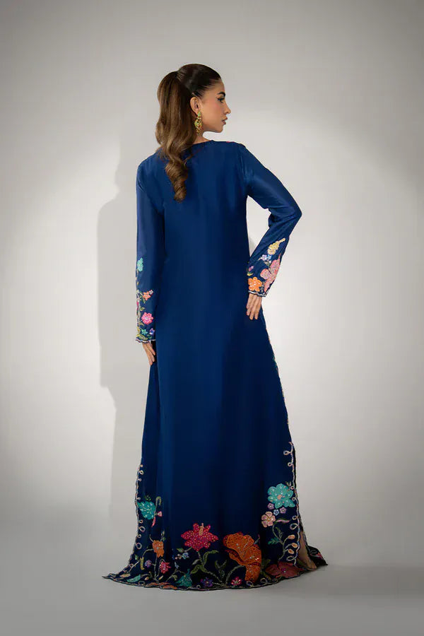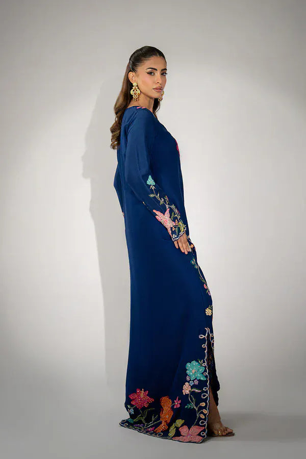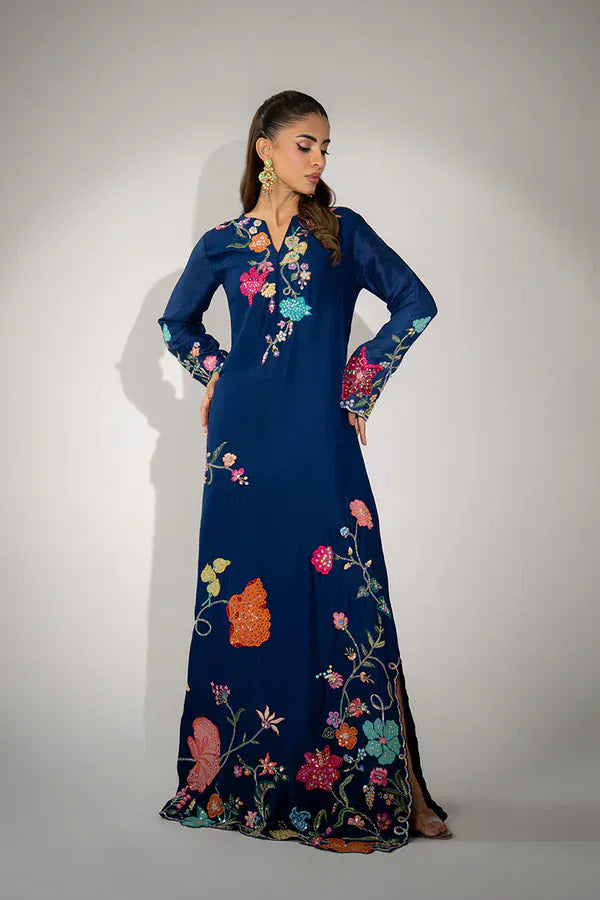 Channeling a sophisticated bohemian flair, this stunning navy blue silk kaftan is a testament to vibrant craftsmanship and fluid elegance. The long-sleeved silhouette is lavishly adorned with bold, multicolored floral appliqués and intricate threadwork, creating a mesmerizing tapestry that flows down the front and cuffs. This statement piece provides a relaxed yet ultra-luxurious feel, perfect for standing out at destination weddings or high-fashion daytime events.