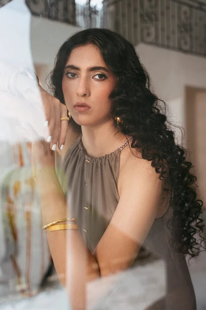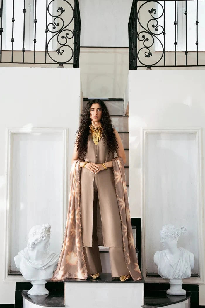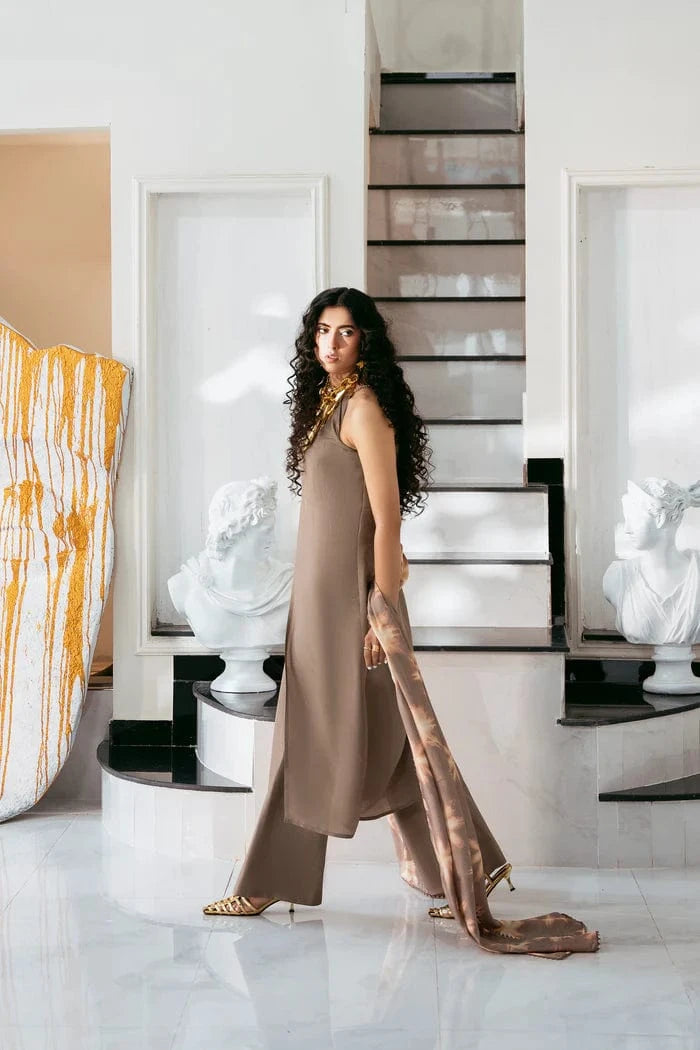 The shirt, crafted from luxurious raw silk in a rich mocca hue, offers a foundation of subtle sophistication. Its front is adorned with delicate golden buttons, adding a hint of classic charm. The halter neckline is a unique focal point, featuring a stylish knot dori that creates soft gathers across the bust, leading to a flattering front slit. Paired witha beautiful dupatta made from flowing silk in a vibrant tie and dye pattern. The dupatta's edges are finished with a delicate lace, adding a touch of traditional grace.Completing this ensemble are straight long pants.
