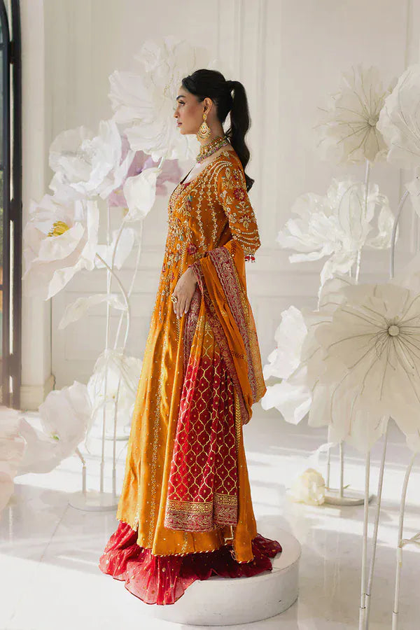 Illuminate your event in this vibrant orange pishwas from Mina Hasan’s Dholki Collection, which perfectly captures a festive, warm glow. The opulent full-length dress features intricate gold zardozi and sequin work on the bodice and a flattering open front, revealing a peek of the rich, ruby-red layered skirt underneath. Complemented by a contrasting red-bordered dupatta, this outfit is a stunning choice for a mehndi or dholki celebration.
