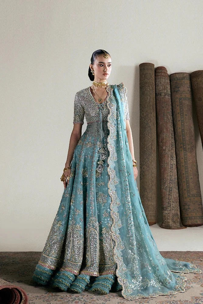 - ORGANZA PISHWAS WITH SCOOP NECKLINE AND TASSEL-TIED DRAWSTRINGS, BOTANICAL AND GEOMETRIC MOTIFS IN SILVER-GOLD EMBROIDERY