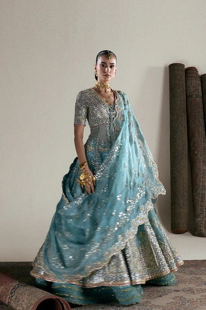 - ORGANZA AND RAW SILK LEHENGA WITH FOIL APPLIQUÉ AND GATHERED BORDER
