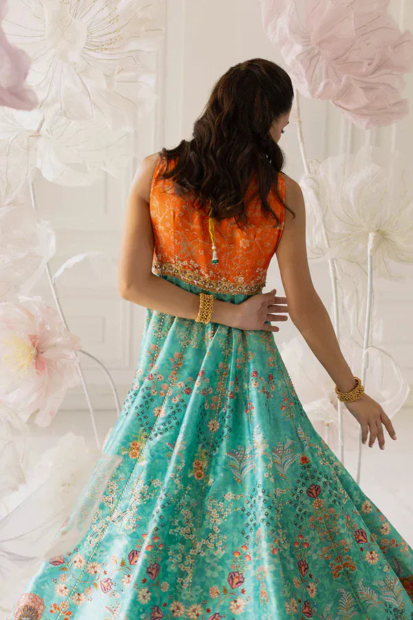 This vibrant pishwas ensemble from the Dholki Collection is a stunning masterpiece of contrasting color and artistry. The full-flared teal blue lehenga and contrasting body are richly detailed with multi-colored floral embroidery and shimmering embellishments that evoke an enchanted garden. It is dramatically contrasted with a brilliant tangerine orange dupatta, finished with an ornate border, making it an exquisite choice for a festive wedding occasion.