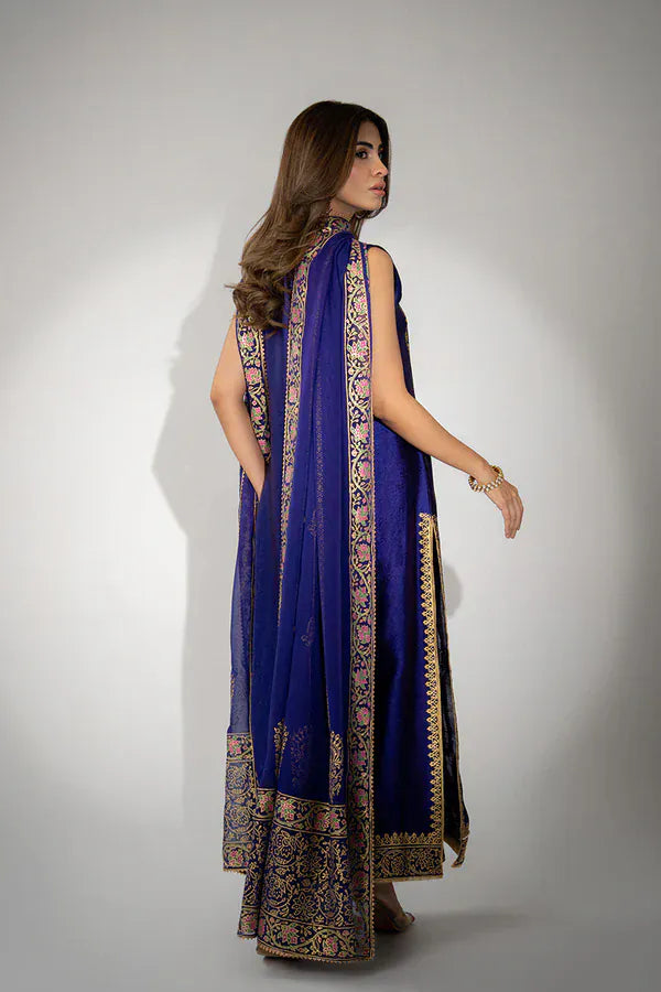 Behold the majestic allure of this vibrant royal blue sheesha silk ensemble, a luxurious piece from our Luxury Pret collection designed for maximum impact. The kurta features exquisite gold block print and zardozi work that outlines the V-neckline and side seams, beautifully framing the embroidered floral motifs in rich pinks and reds. A magnificent contrasting border featuring baroque-inspired patterns anchors the outfit, complemented by a matching dupatta to deliver redefined elegance for any grand occasion.