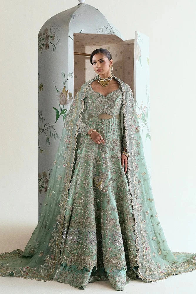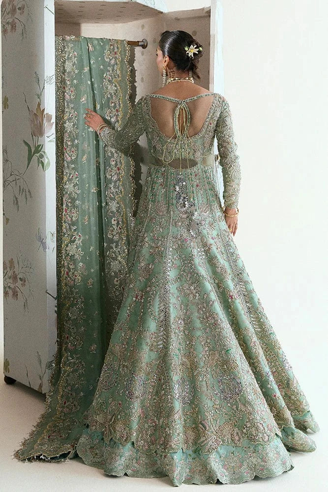 - SAGE GREEN PISHWAS WITH SWEETHEART NECKLINE, SHOULDER CUTOUT, AND 10-PANEL DESIGN FEATURING MOROCCAN, TURKISH, AND SOUTH ASIAN SUZANI MOTIFS WITH MIRROR AND PASTEL DETAILING