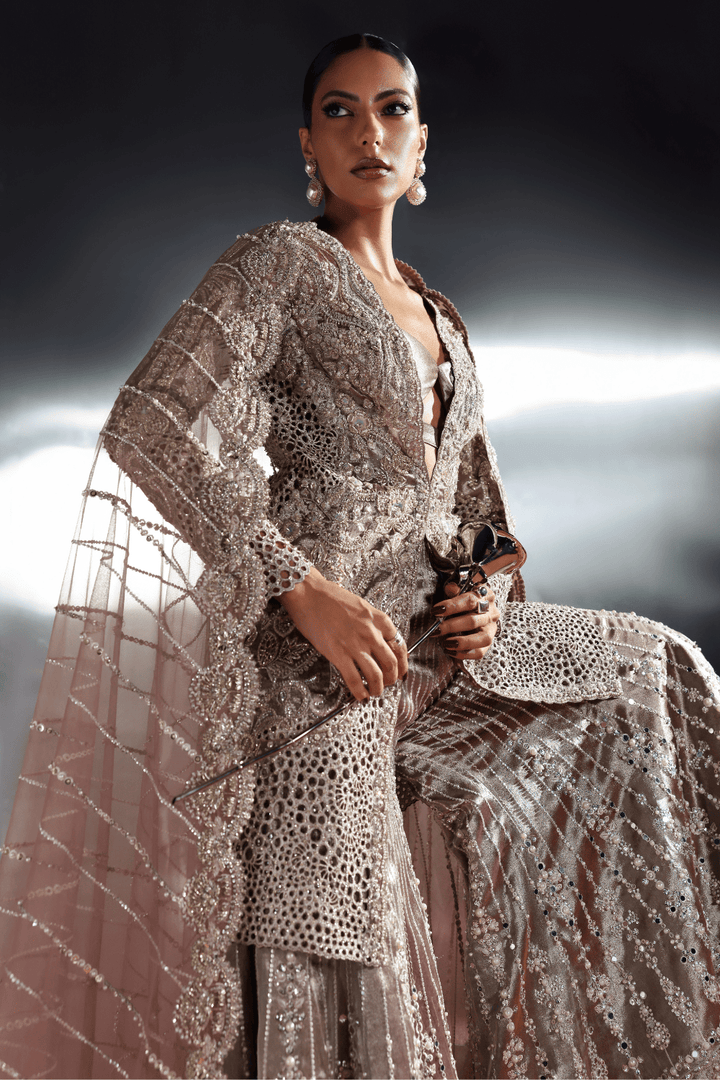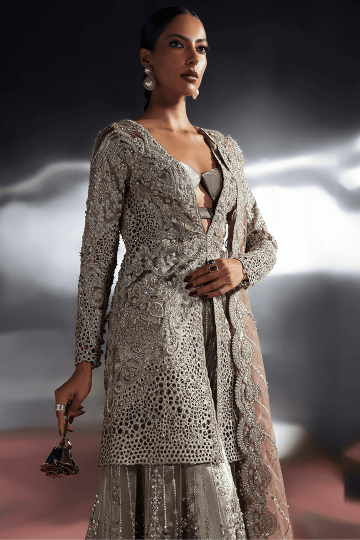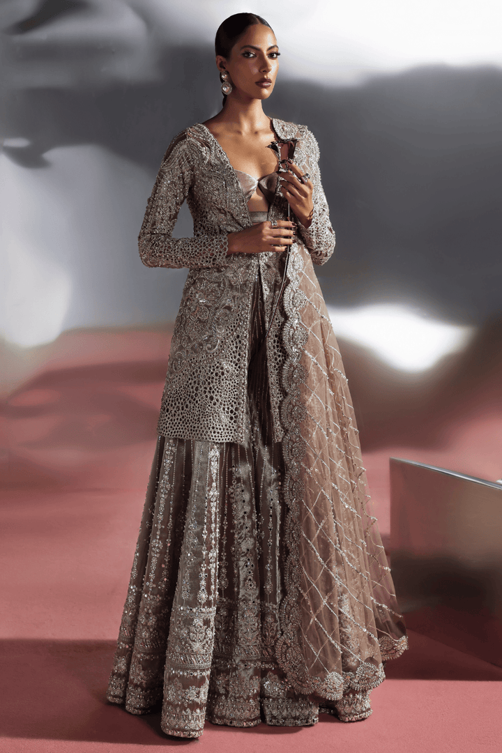Astrell features a jacket and sharara crafted on a gun metallic tissue base. The outfit is intricately hand-embellished with fine detailing, paired with a net dupatta adorned with delicate cutwork. A statement look designed for modern celebrations
