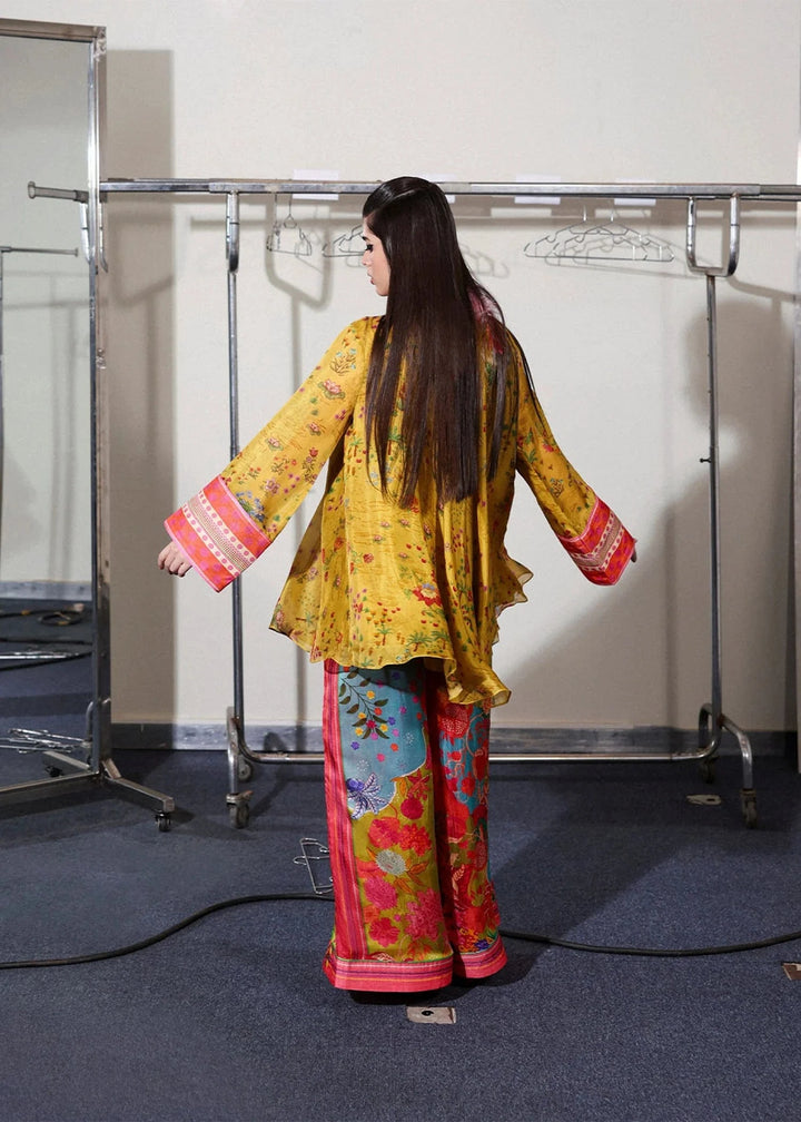 A mustard mid-thigh A-line silk shirt adorned with soft floral prints, accented by bold geometric printed borders at the sleeve hems. The neckline is finished with delicate fabric tassels, adding movement and charm. Paired with multicolored floral printed flared pants, detailed with striking pink borders along the hem and side seams — a vibrant blend of pattern, color, and fluid silhouette.