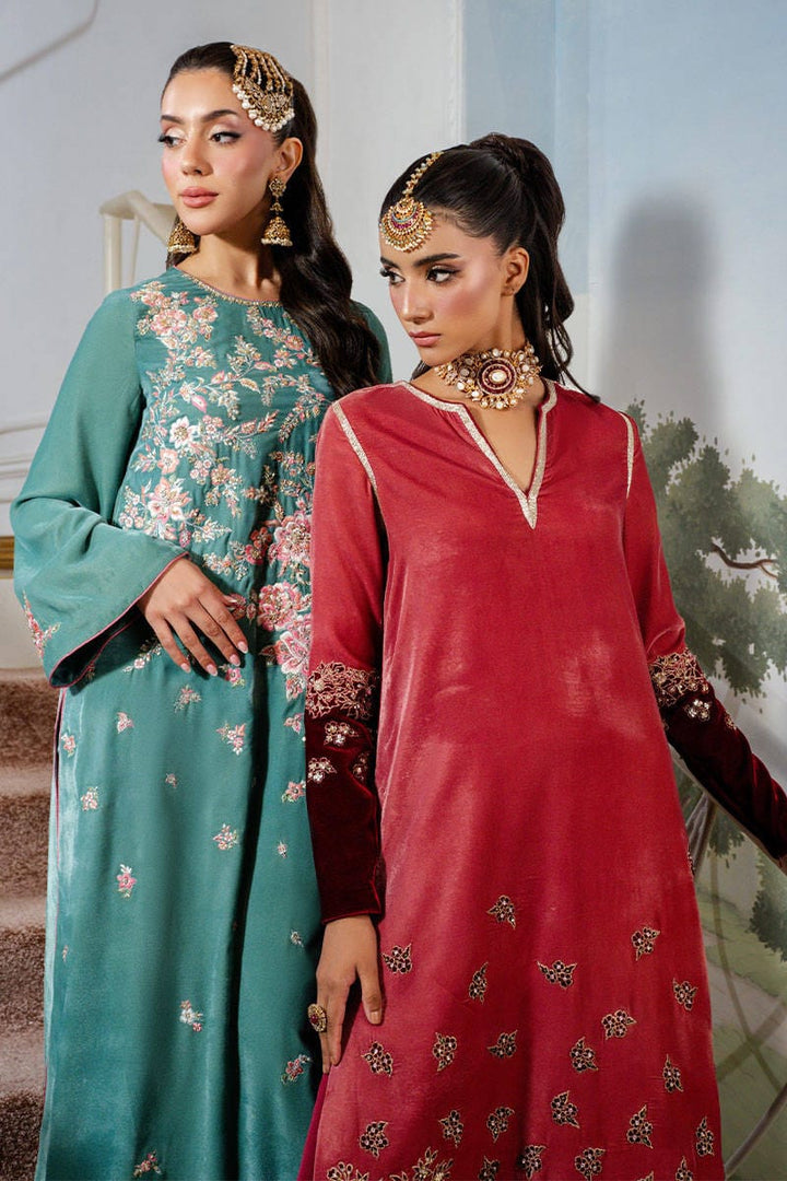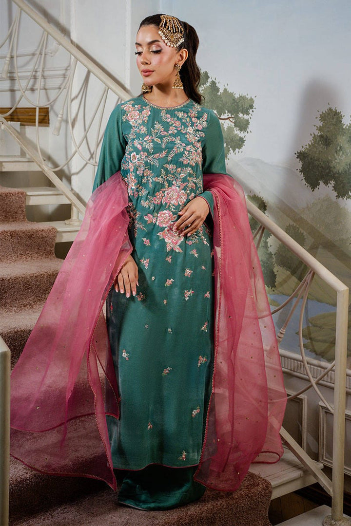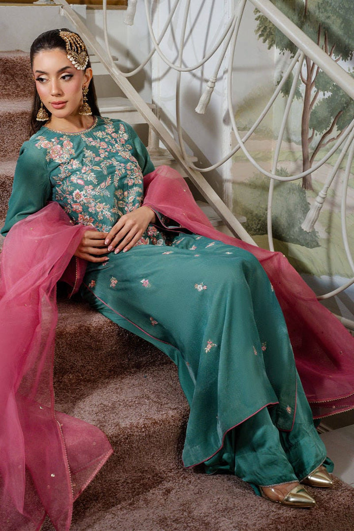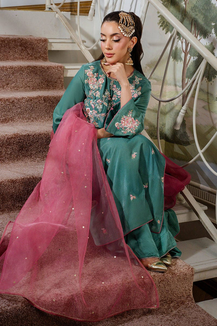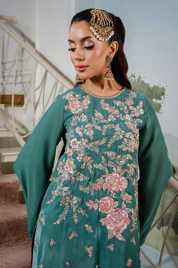Callice is a stunning turquoise long shirt featuring intricate embroidery and delicate hand embellishments throughout. Paired with silk pants and a contrasting salmon pink organza dupatta adorned with a subtle sequin spray, this ensemble exudes festive elegance with a refined charm.