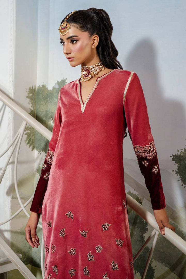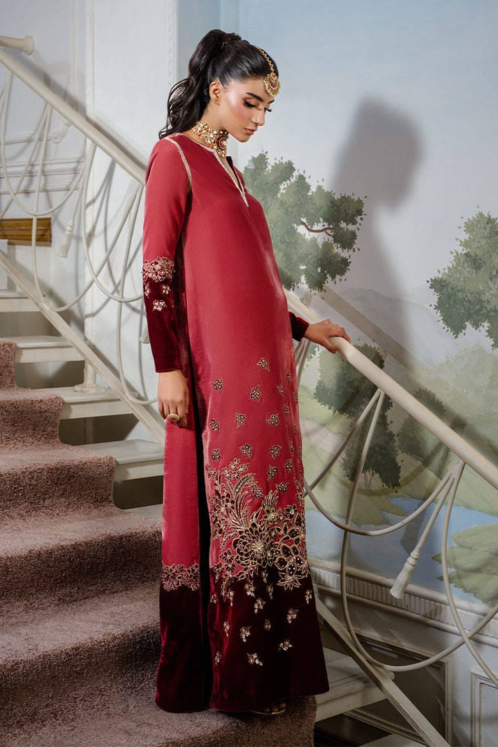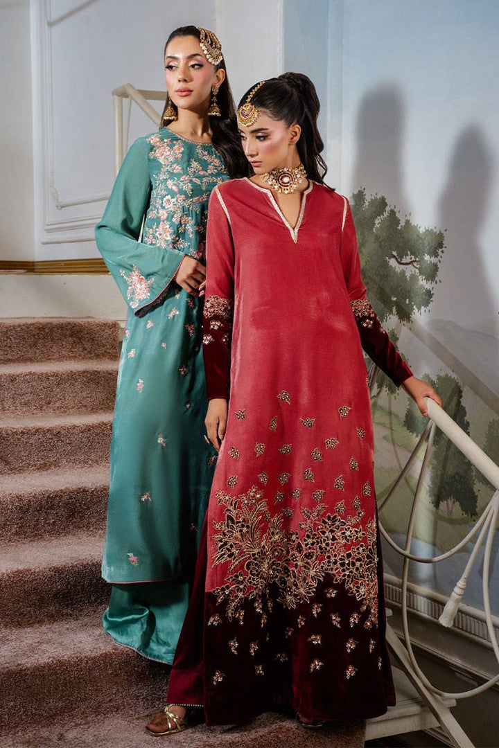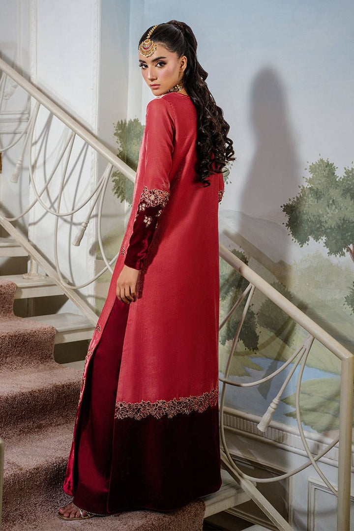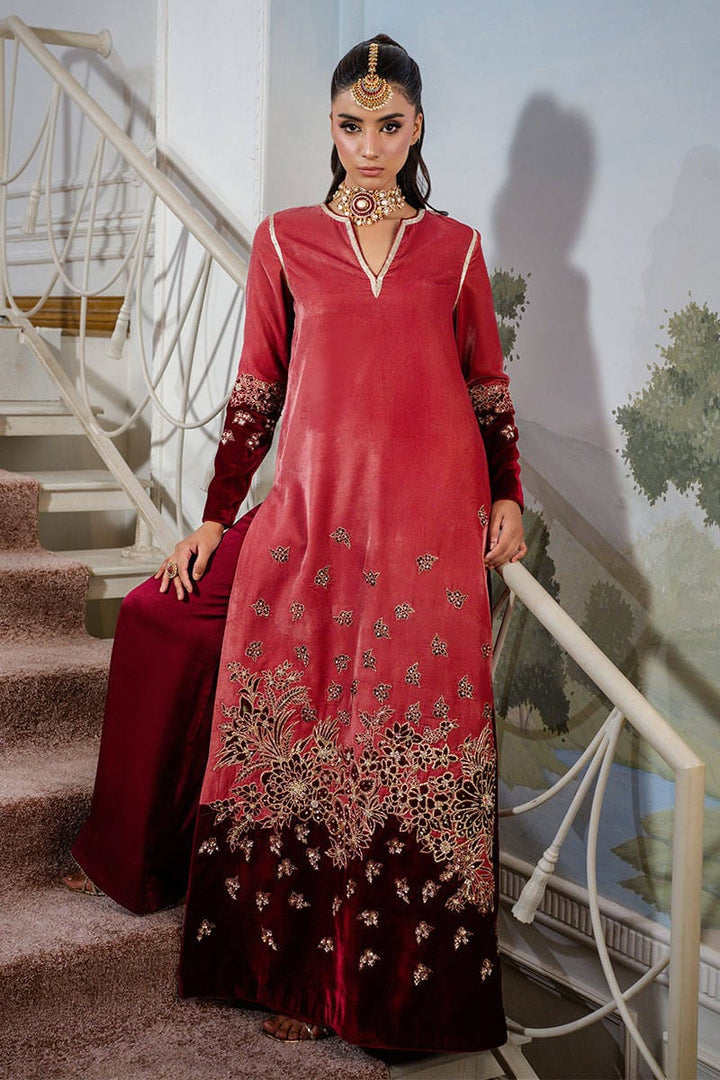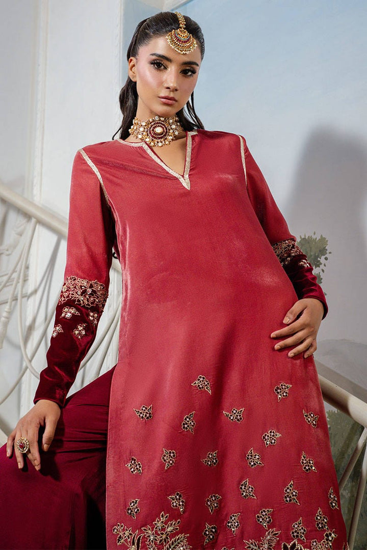 Cherry Wine is a striking dual-toned full-length shirt adorned with intricate embellishments, embroidery, and delicate gota detailing. Paired with flared pants that add a touch of contemporary charm, this ensemble perfectly balances modern elegance with traditional allure. Complete the look with a maroon dupatta for a sophisticated, festive finish.