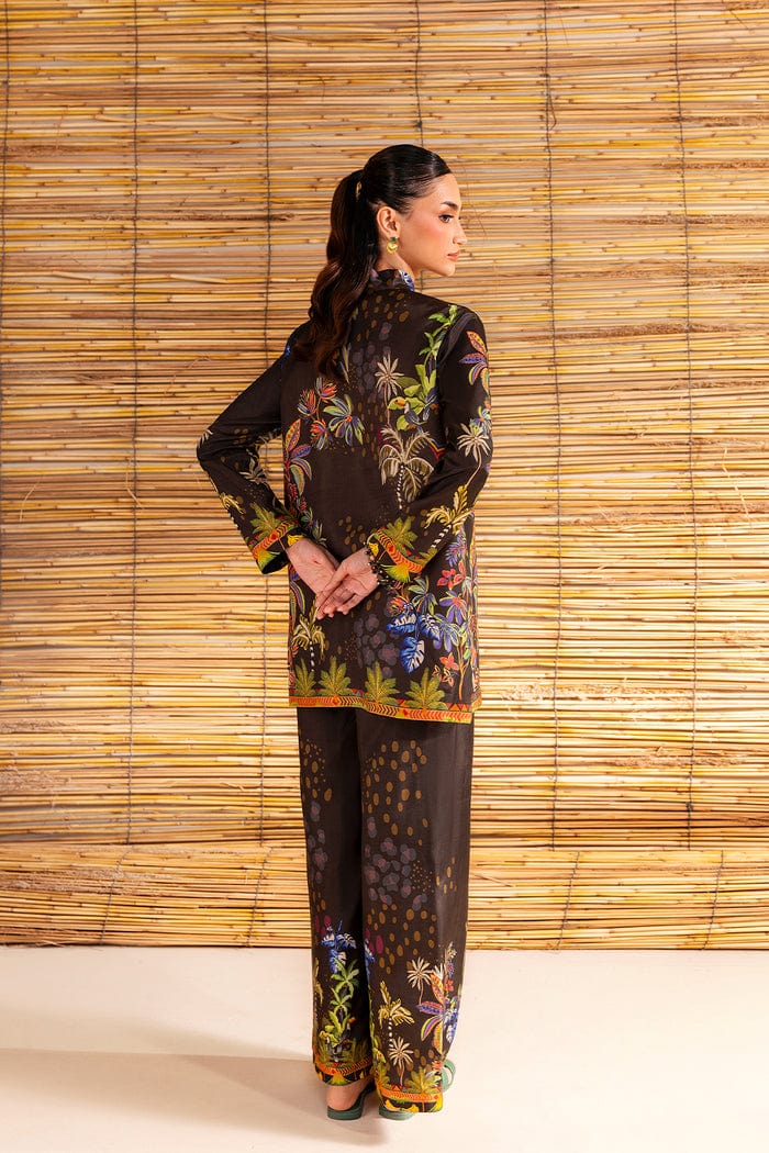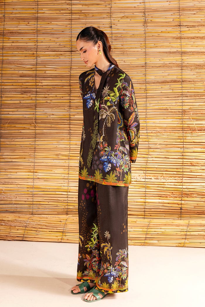 A midnight silk dream, Éclat Noir Botanique is a true embodiment of elegance and allure. Cut from lustrous silk that drapes with liquid fluidity, the silhouette flows in a relaxed tunic with a keyhole tie-neck and wide-leg trousers that move with unrestrained grace. The canvas, drenched in jet black, is alive with painterly botanicals — vivid bursts of cobalt, emerald, and amber cascading like a tapestry of exotic flora. Sophisticated, statement-making, and unapologetically luxurious — this is signature glamour, elevated for evenings where refinement meets bold artistic expression.