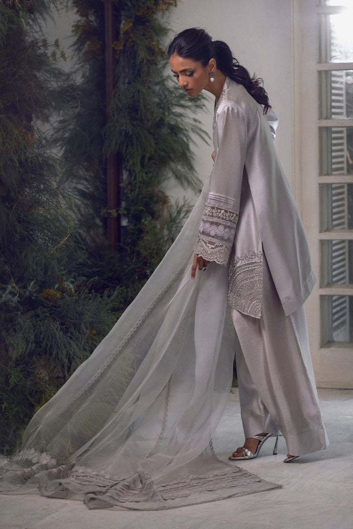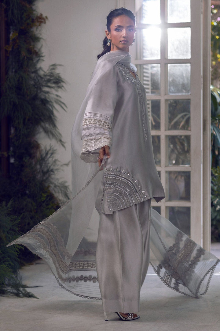 Knee-length shirt crafted from pure shisha silk, featuring ethereal organza embellishments on the daman and neckline. The hem and neckline are elegantly adorned with pearls and luminous stone accents. This shirt is designed to be paired with matching Farshi shalwar and a coordinating organza dupatta, which showcases an embossed organza border and intricate lace details.