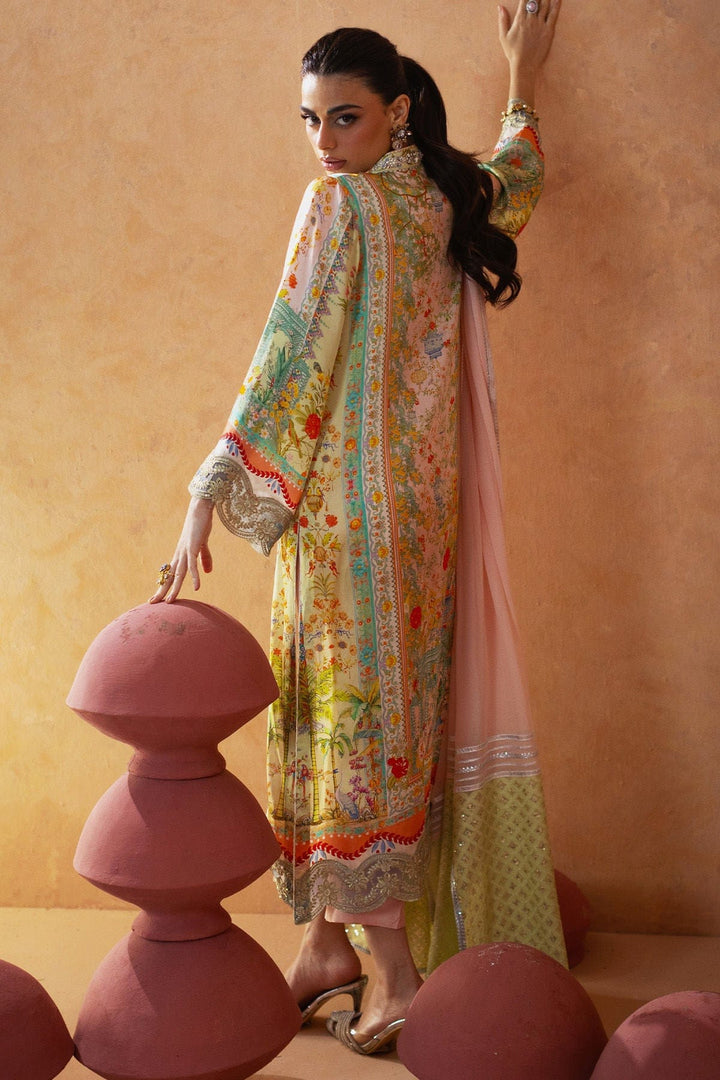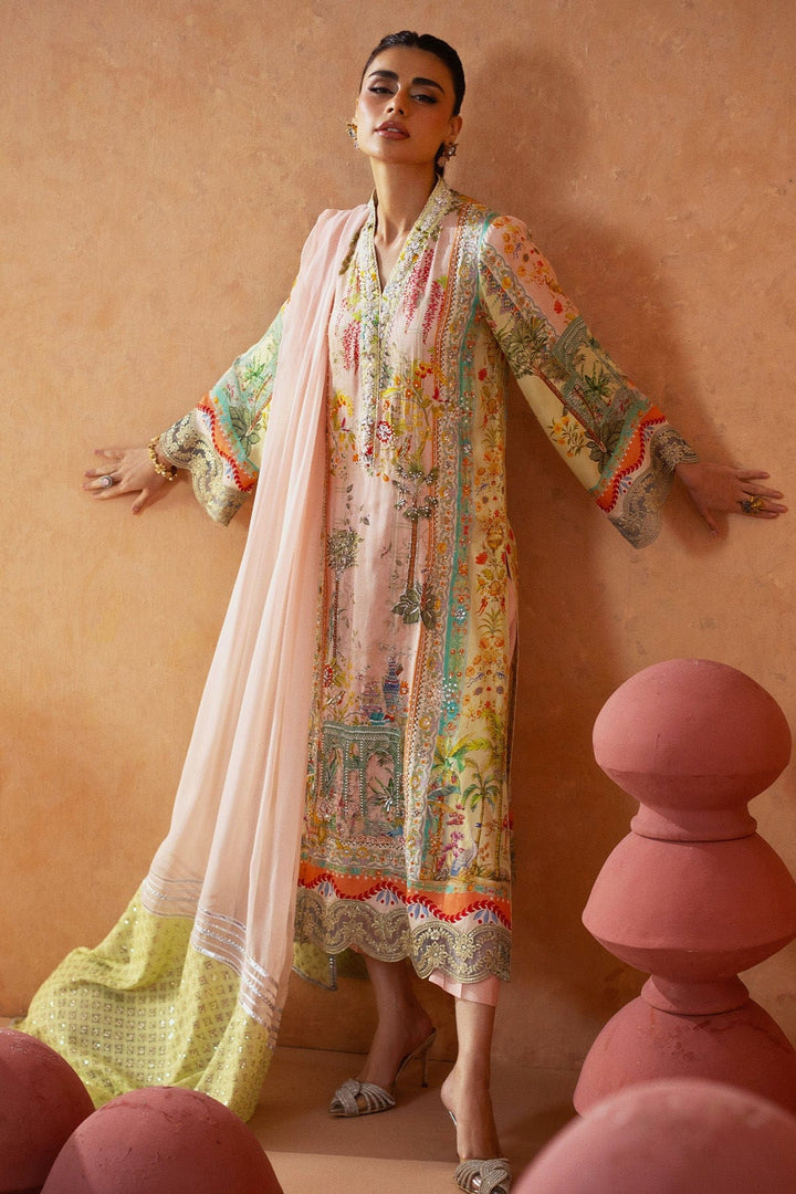 An A-line shirt crafted from silk canvas, presented in an exquisite combination of blossom pink and mint green, showcases intricate silver hand-embroidered details at the center front and an overlapping neckline. The hem of the shirt is perfectly adorned with an appliqué featuring a zari embroidered border. This ensemble can be elegantly paired with a designer dupatta, which includes light-catching sequins panels on each pallu, embellished with gota accents. The outfit is complemented by matching straight pants, ensuring a sophisticated appearance for the festive season.