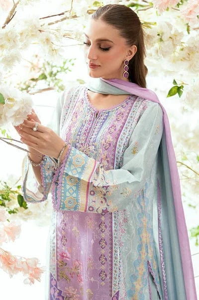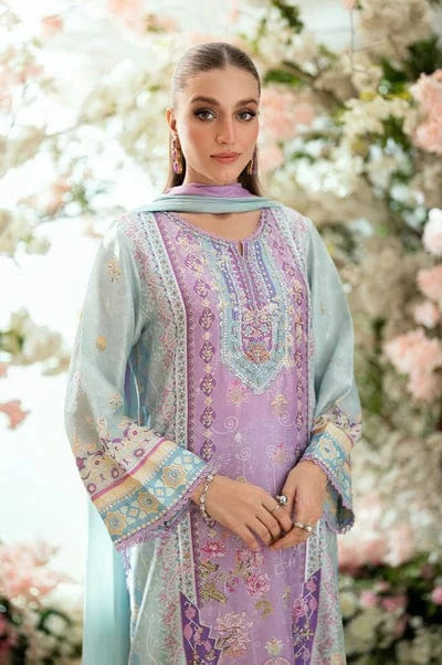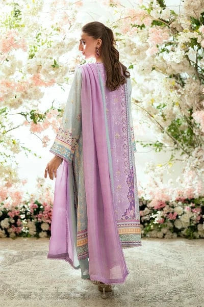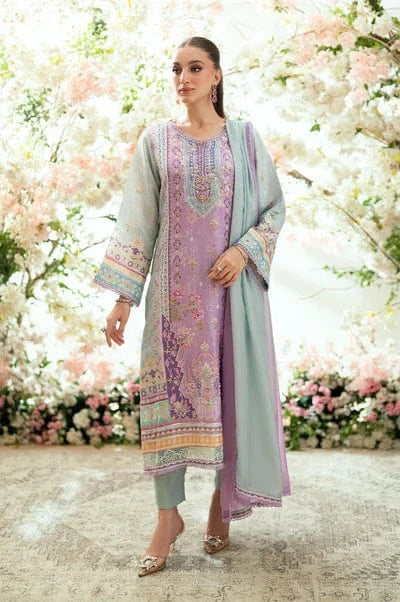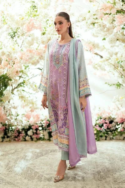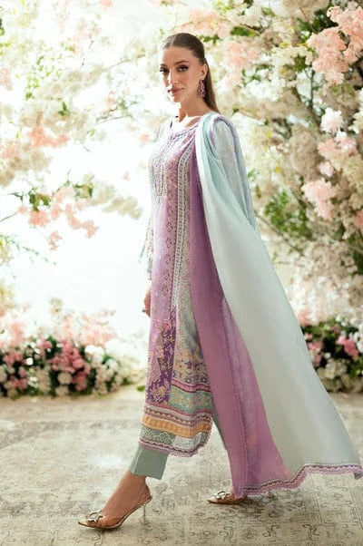 Immerse yourself in the art of refined dressing with Sarah Sheeraz’s latest creation, Elara—a breathtaking composition of color, craftsmanship, and elegance. Cut from pure raw silk, the shirt features a delicate interplay of sky blue and violet hues, brought to life with intricate in-house prints that speak to the signature aesthetic. The neckline is a masterpiece of heavy hand embellishments, meticulously adorned with traditional techniques that shimmer with every movement. Finished with a soft schiffli border for added texture, the look is elevated with an ombre silk dupatta that gracefully echoes the shirt’s tones, creating a harmonious flow. Paired with trousers, Elara is the epitome of festive luxury—designed for moments that call for timeless impact.