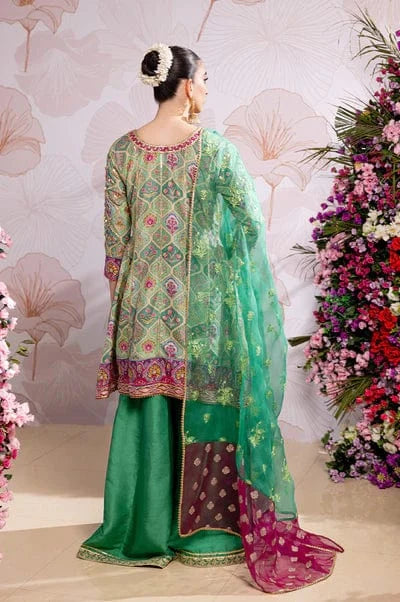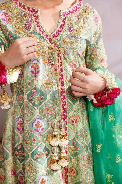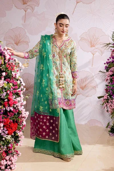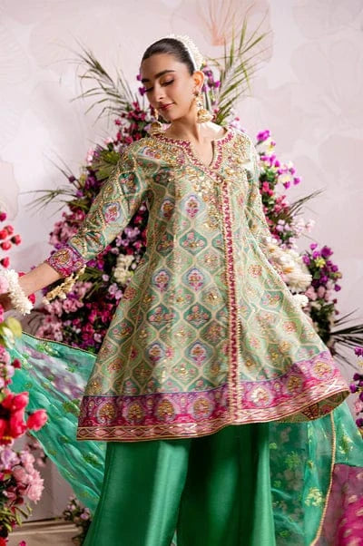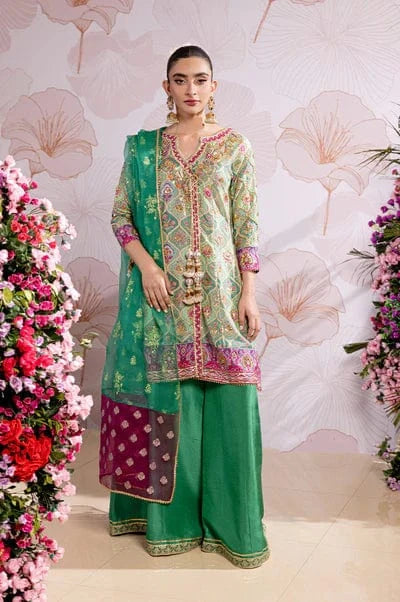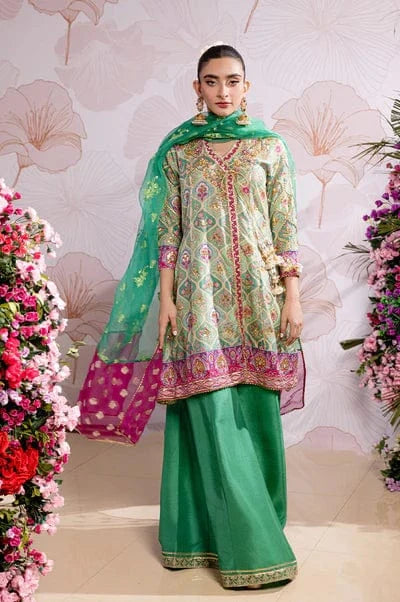 organza dupatta. The shirt is elevated with a playful green print and contrasting border.