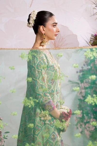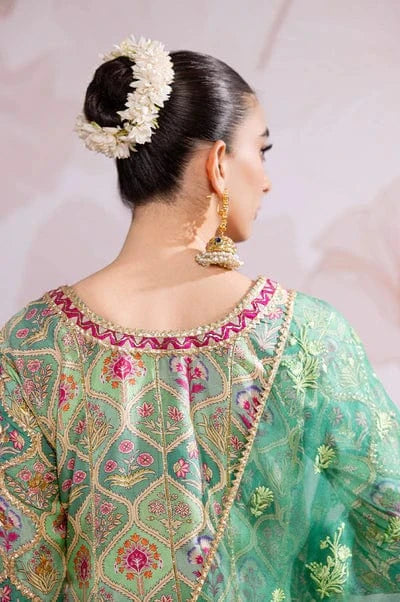 Regal meets contemporary in a multi green shades, pure raw silk and embroidered