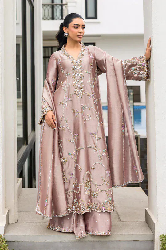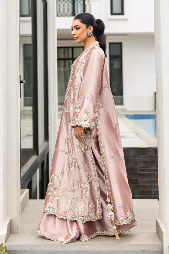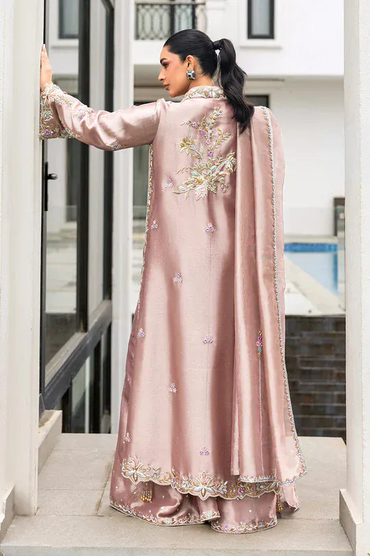 A graceful pink lame long-length shirt, exquisitely detailed with a heavily embellished border and a beautifully designed neckline. The full sleeves are refined with intricate embroidery, while the back is highlighted with a delicate motif and playful tassel accents for an added touch of charm. Paired with a lame dhaka featuring an elegant bordered finish, the ensemble is completed with a zari net dupatta, adorned with sequin work and subtle finishing for a soft shimmer. A romantic yet regal creation that radiates timeless elegance.