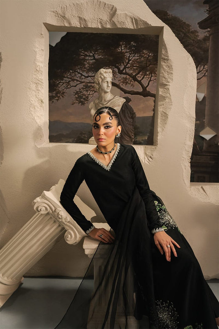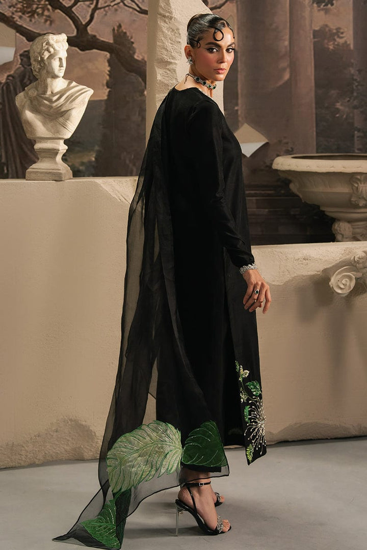 Blending chic sophistication with contemporary charm, Esra is a true ode to modern minimalism. The pure black raw silk shirt is brought to life with intricately composed floral motifs, enriched by craftsmanship through sequins, crystals, and pearls. Paired with sleek pure raw silk cigarette pants, the look is elevated by its organza dupatta the statement piece of the outfit adorned with exquisitely embellished 3D leaves that exude ethereal elegance.