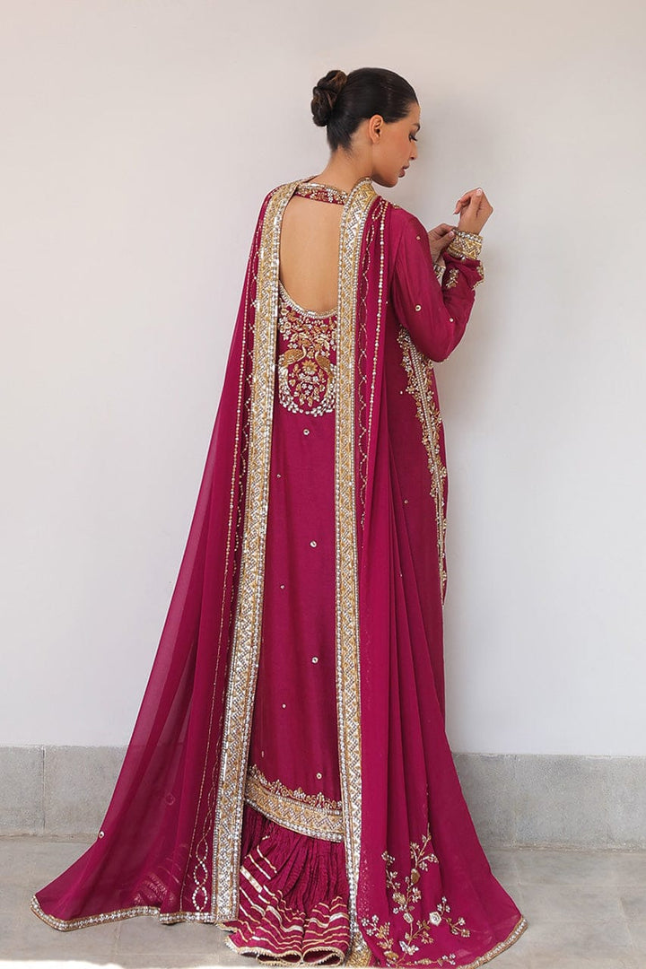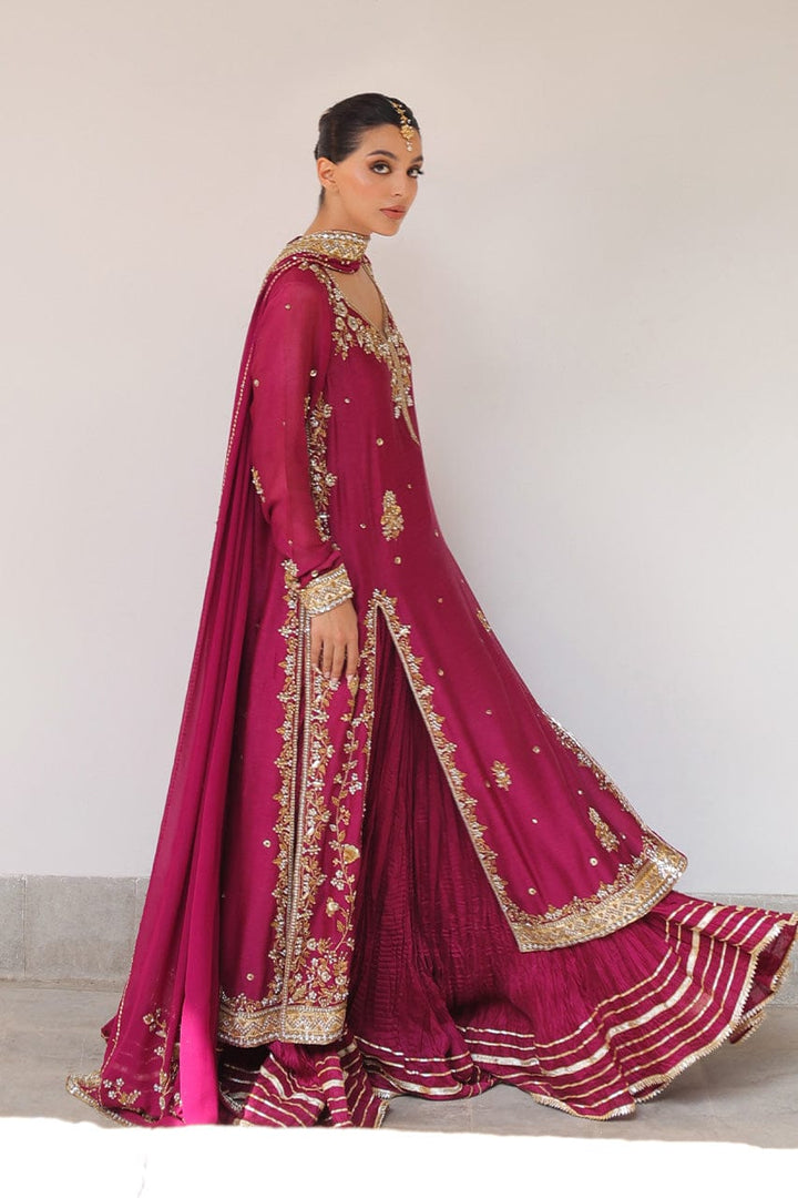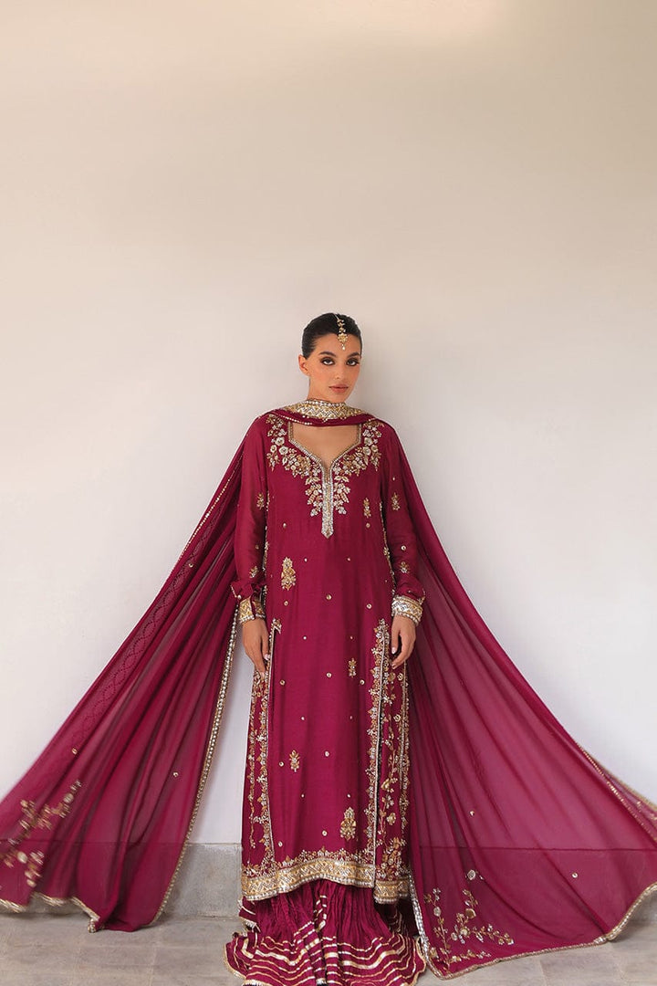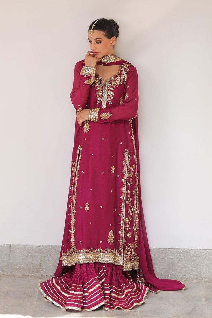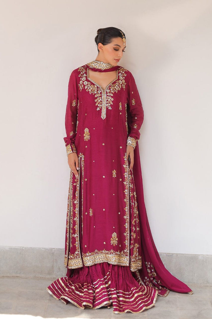 Echoing heirloom grandeur, a rich mulberry toned flowing shirt in cotton net is adorned with antique zari florals, sequin accents, and gota edges. The trapeze neckline and fitted full sleeves are embellished with zardoze that continues down the dramatic front slits. A fluid georgette dupatta in a matching hue is meticulously finished with dense embellishment along a contrasting border and scattered sequins. Paired with a voluminous crushed khaddi silk lehenga detailed with gota, this look channels regal romance with artisanal charm.