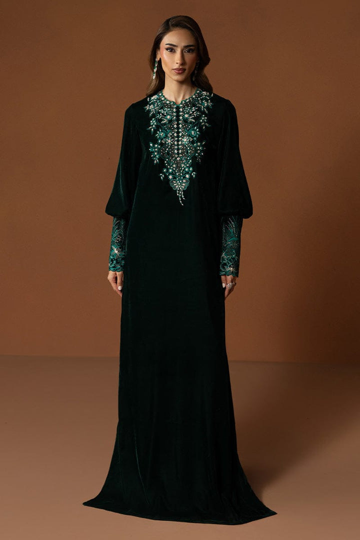 Draped in a long kaftan, a deep, regal green color, Giselle has intricately adorned detailing gracing the neckline and cuffs, adding layers of sophistication. Paired with sleek cigarette pants, it’s a portrait of effortless elegance and quiet grandeur.