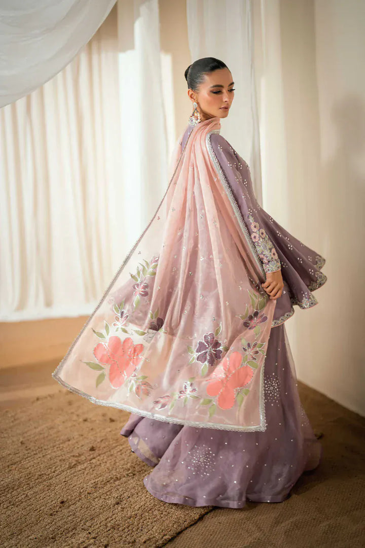 A standout voluminous silhouette in a front open peplum in an exquisite lavender shade cut in pure raw silk, adorned with resham and zardozi embroidery enhanced with silver Mukesh. Its sleeves are embellised with an appliquéd embroidered pattern further elevating the look.