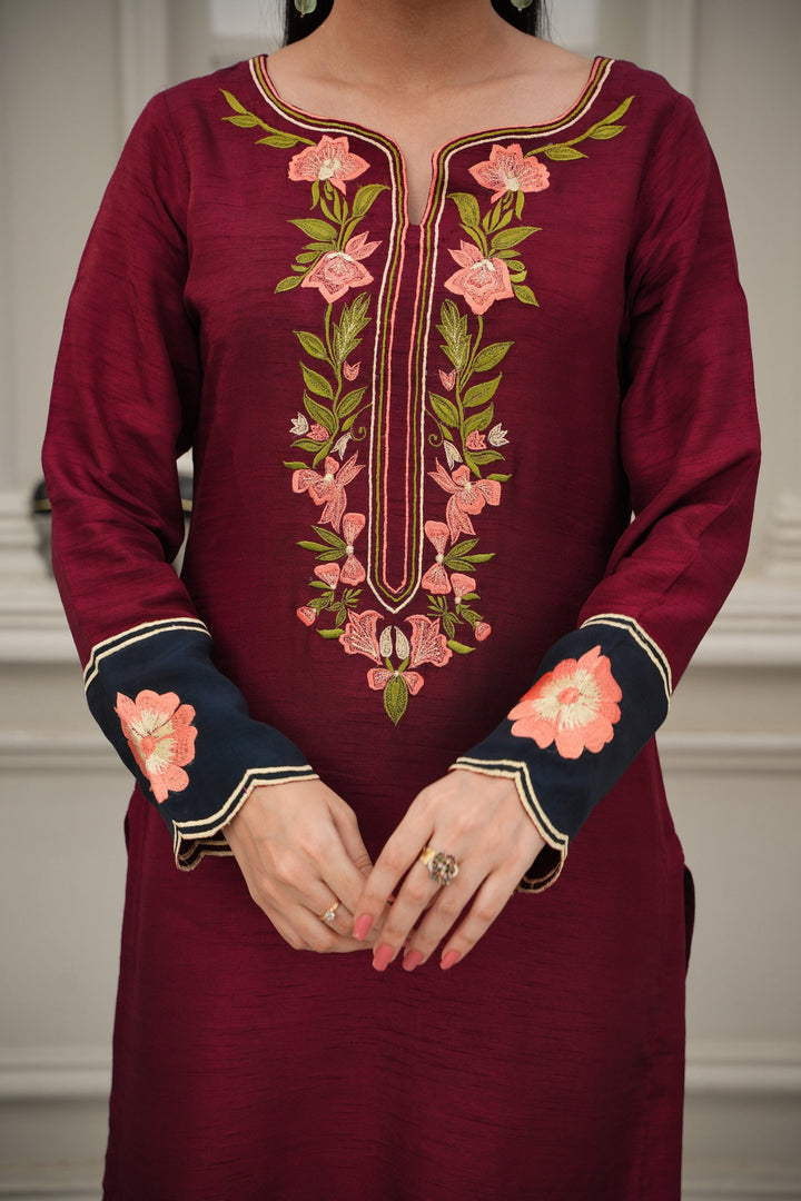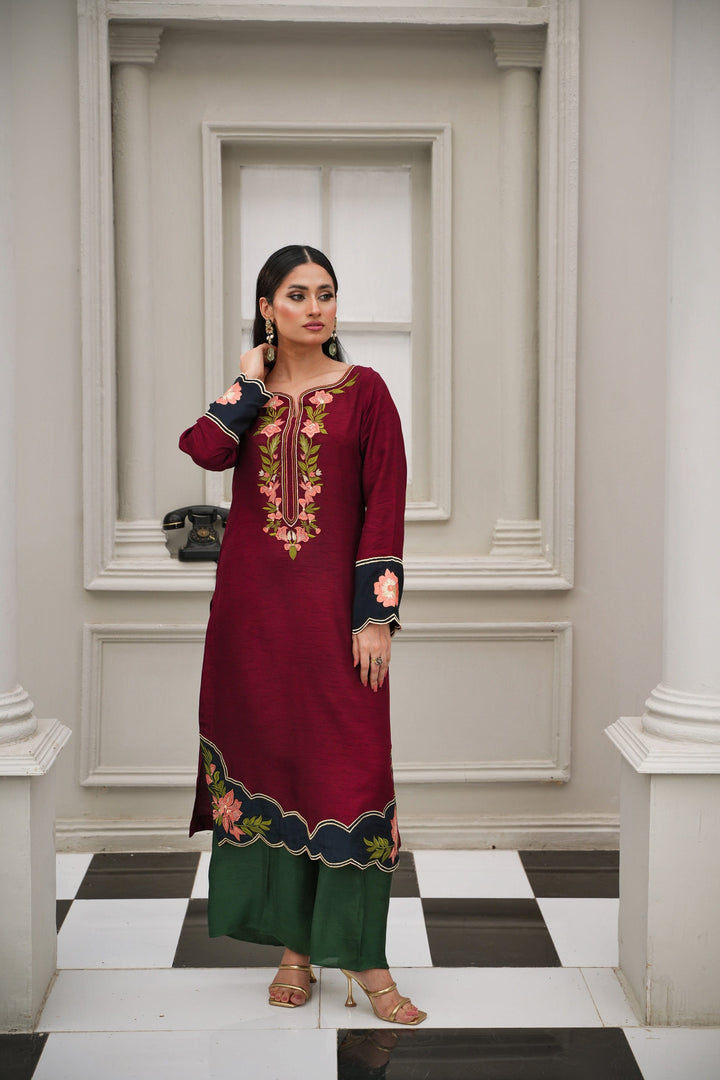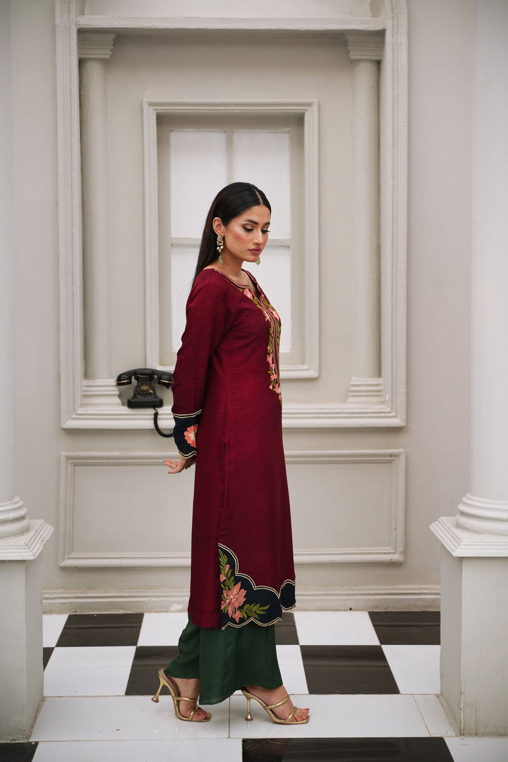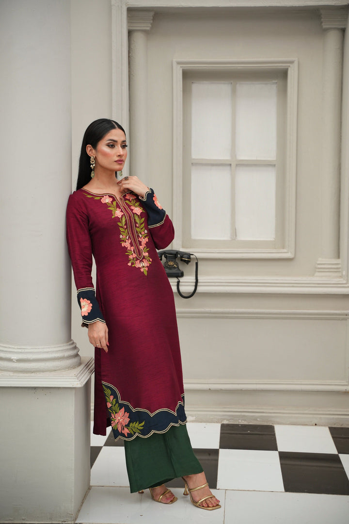 Adorned with delicate silk thread embellishments, this exquisite Crimson Regalia ensemble reflects timeless grace and sophistication. The shirt, crafted from premium Korean Raw Silk, features Midnight Navy appliqué detailing and a rich, luxurious texture. It is paired with Midnight Navy Korean Raw Silk trousers, creating a striking contrast that enhances the outfit’s regal allure.