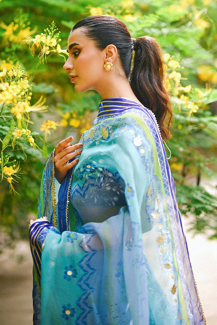 In serene shades of sky and aqua, this ensemble strikes a balance of artistry and finesse. The ebony velvet cropped blouse is richly embroidered with gilded vines and florals, its dark surface shimmering against the light. It is paired with a flowing pure rawsilk lehenga in layered tones of blue, adorned with fine gota embroidery, delicate sequins and painterly florals that scatter across its expanse. A diaphanous organza dupatta, edged with gota and finished with tasselled accents, completes the look with refined elegance.