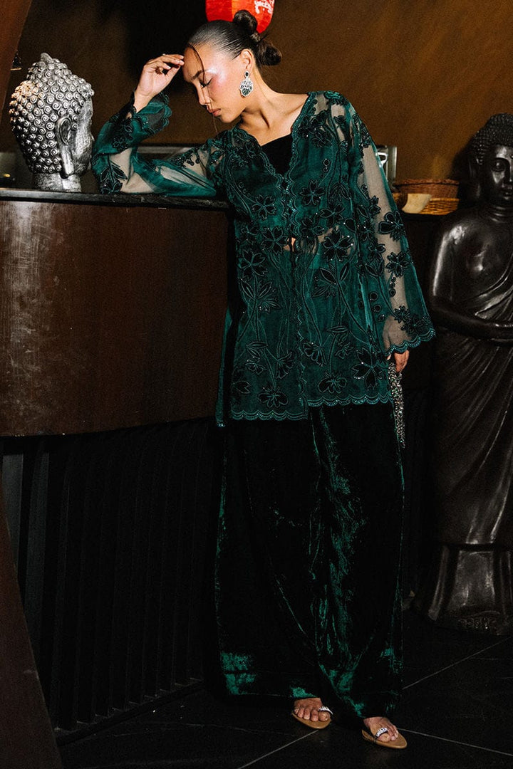A luxurious front-open organza jacket featuring soft scalloped edges, enriched with velvet appliqués and intricate hand-embellished detailing. The shimmering cutdana and sequin work add a refined sparkle, elevating the jacket’s airy elegance. It is paired with a rich velvet bandeau and matching wide-leg velvet pants, creating a striking contrast of texture and sophistication. A contemporary yet opulent ensemble perfect for evening glamor.