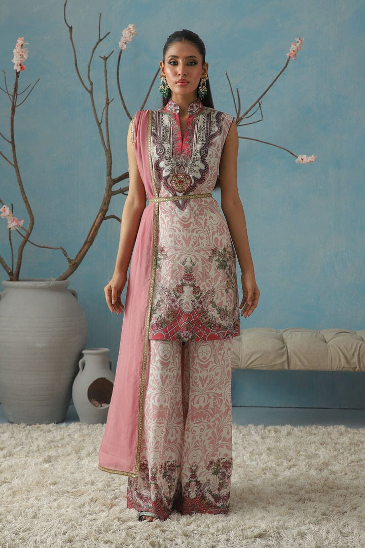 Straight, sleeveless short kurta paired with printed trousers, featuring stunning Baroque and Mughal-inspired pink floral prints with delicate golden outlines. Finished with a plain dupatta for a perfectly balanced, elegant look. Dupatta can be added seperately. Sleeves can also be added as per the customer's demand.