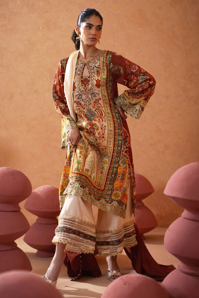 Knee-length shirt crafted in earthy tones on silk canvas, embellished with a traditional Hyderabadi neckline featuring a contemporary twist. The hem is accentuated with intricate zari appliqué details, and the shirt can be complemented with an izaar that showcases exquisite gota detailing. This ensemble is further enhanced by an ombré silk dupatta, designed to make a striking impression this festive season.