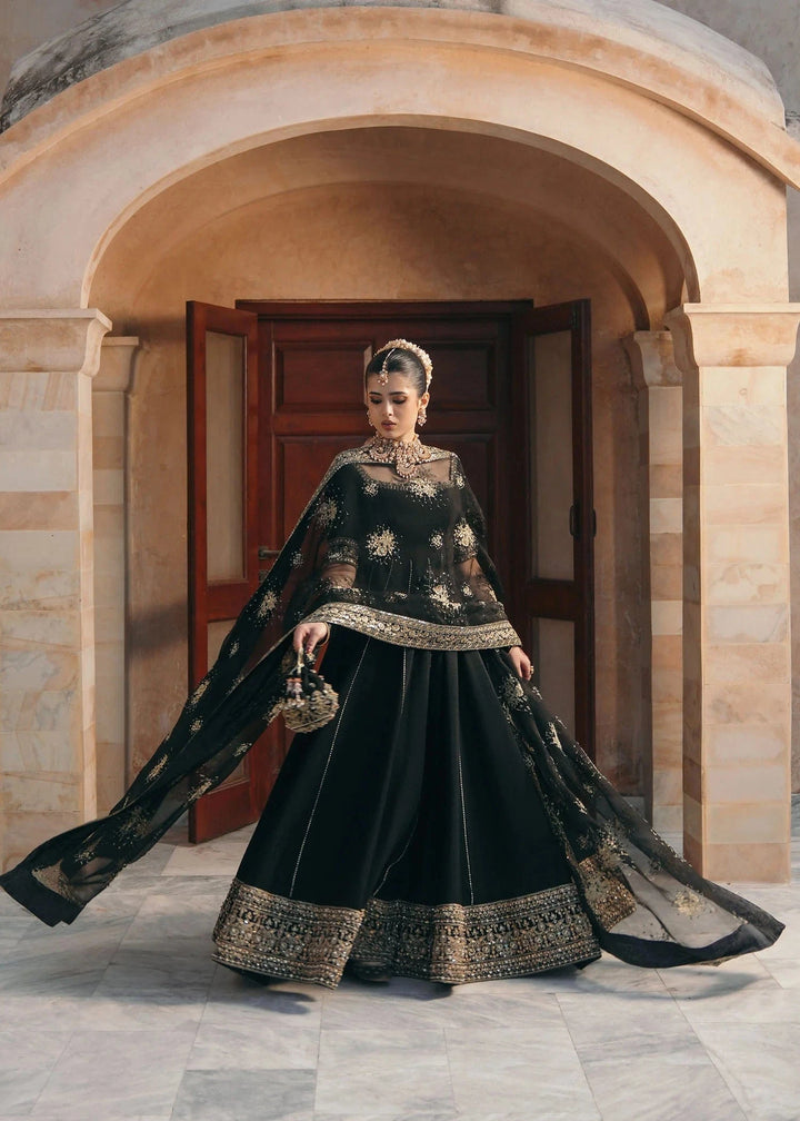 Classic meets contemporary in this elegant black pishwas, tailored from premium Korean fabric for a soft, flattering fall. Detailed with gota lace panels and a finely embroidered square neckline, the silhouette brings together grace and structure in perfect harmony. Paired with a traditional churidar pajama and a heavily embroidered dupatta, this three-piece ensemble is ideal for festive evenings, intimate weddings, or any occasion where timeless style is key. Understated yet striking—this is black done beautifully.