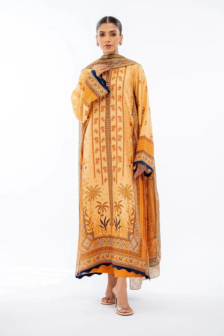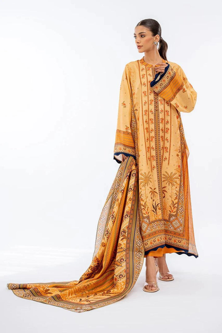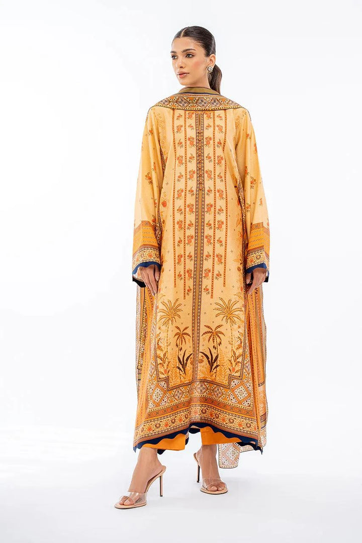 A two toned printed khaddi silk shirt is cut from delicate shades of mango yellow and clementine and features floral imagery with fabric manipulated details on the sleeves and daaman. Paired with matching rawsilk culottes and a printed medium silk dupatta.