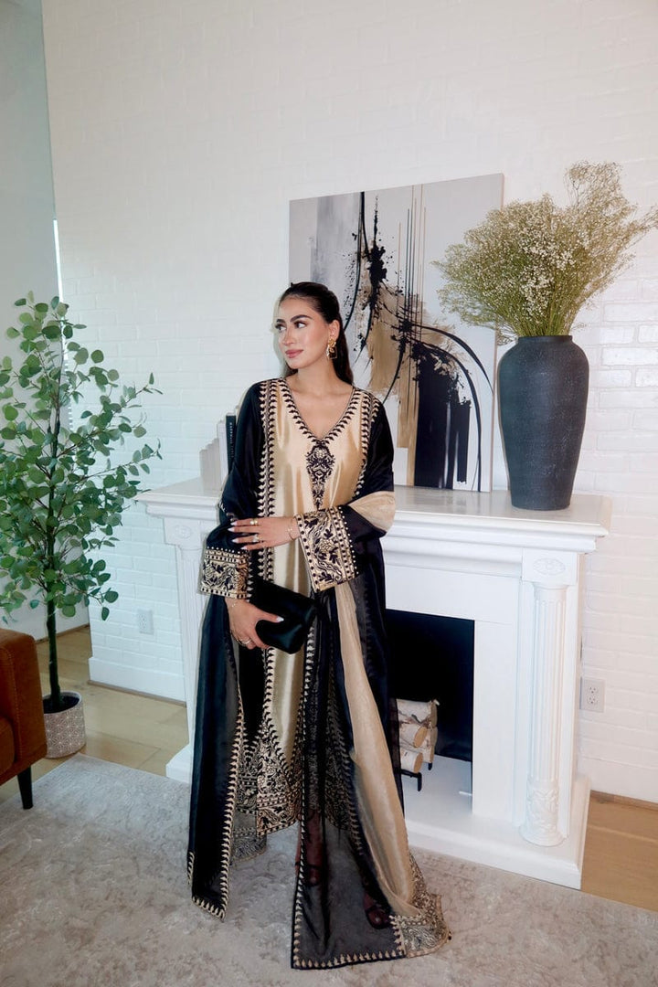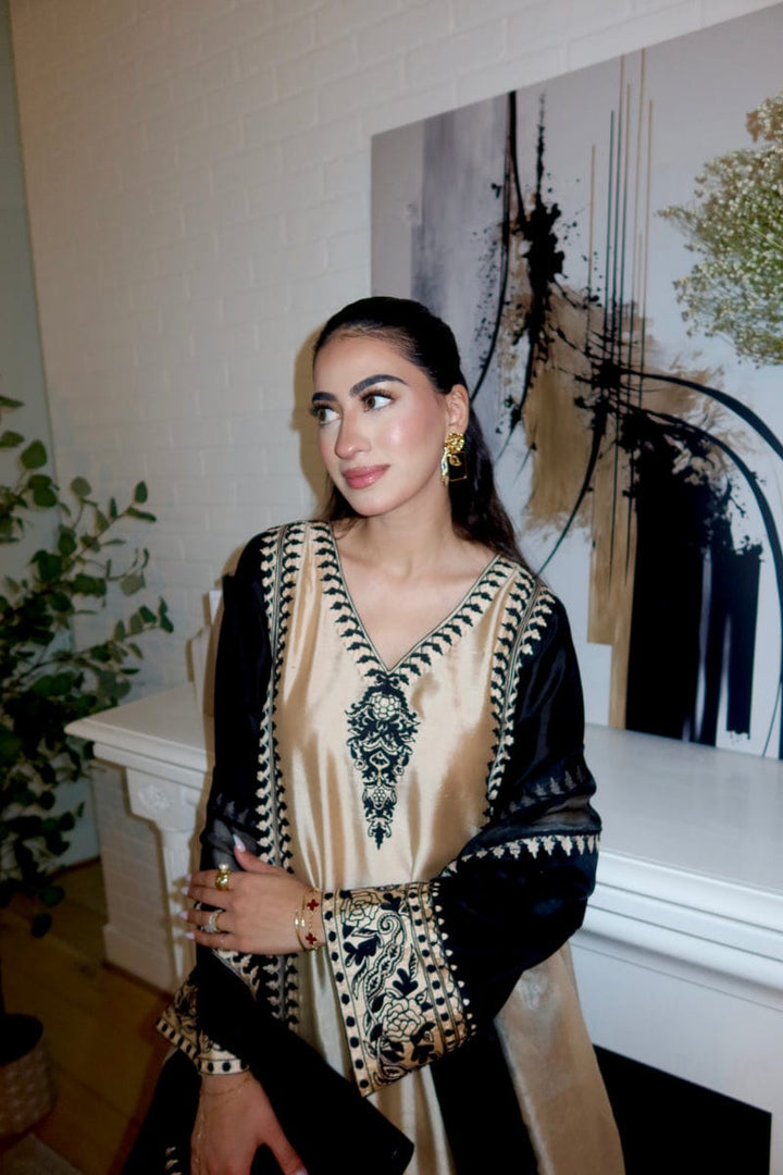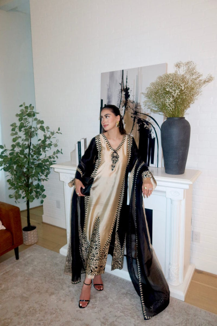 Stylish knee-length shirt paired with elegant bootcut pants featuring delicate double dori embroidery on the front and motif detailing at the back. Completed with a graceful scalped and finished organza dupatta. This chic outfit is a perfect blend of sophistication and modern charm.