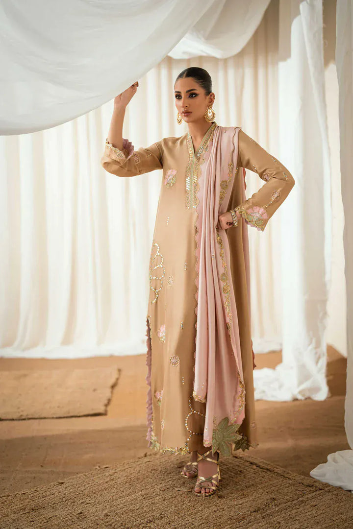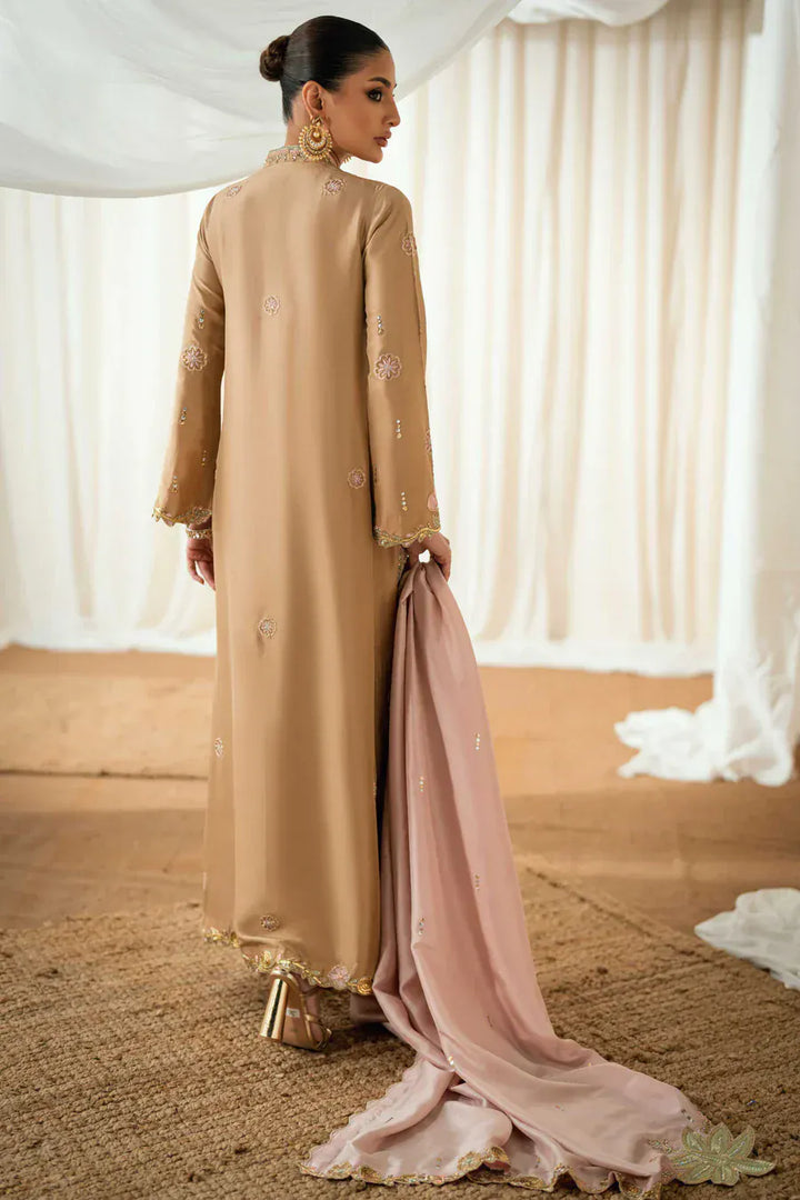 A royal shade of dull gold effortlessly cut in pure raw silk kaftaan, with appliquéd floral motifs, further beautified with gold silver Mukesh patterns on shirt, sleeves and neckline edged with hand embroidered borders on hemline.Completing the look, it is paired with embellished pants and a heavily embellished silk duppatta edged with pretty floral motifs.