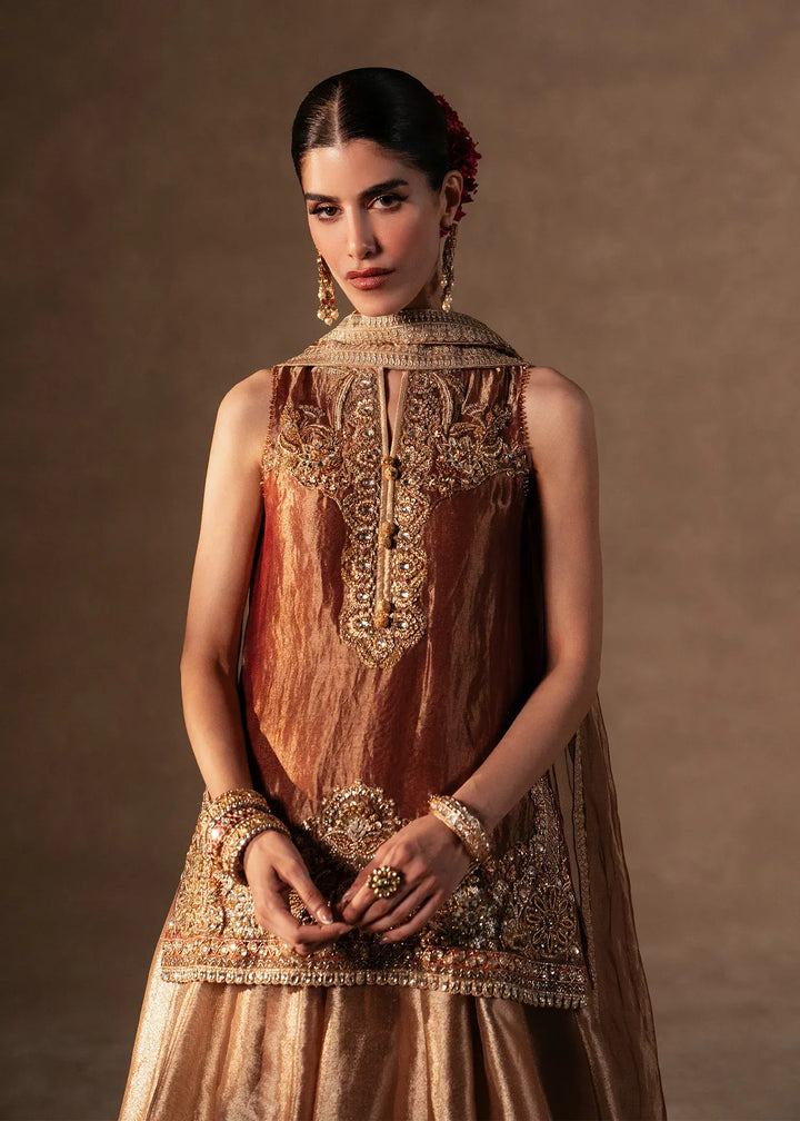 Handcrafted in timeless zardozi techniques, metallic tones of gold and copper tissue come together to present a gorgeous festive offer for the season ahead. This lehnga choli is a stunning keeper that you would want to pull out time and again.