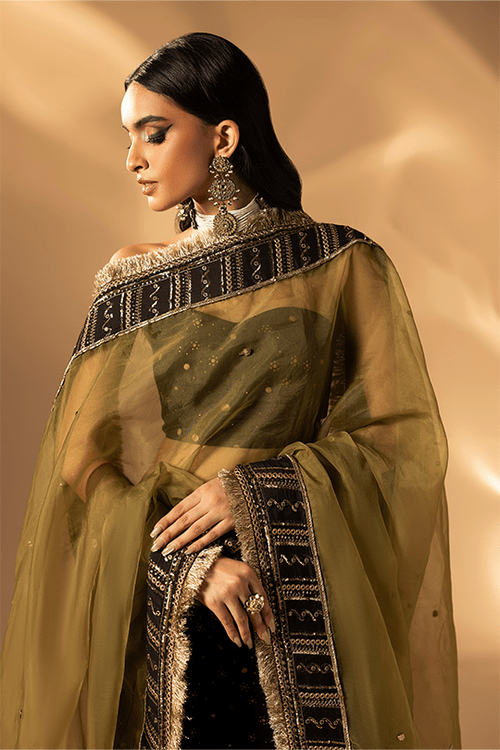 A striking black-gold design with a pure zari tissue shirt layered over a silk camisole, paired with a printed raw silk trouser and an organza dupatta. The bold cut is elevated with embroidery and fine handwork in beads, stones, pearls, gota, dabka and naqshi, making it a perfect statement piece.