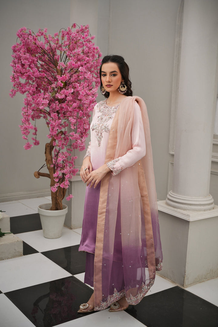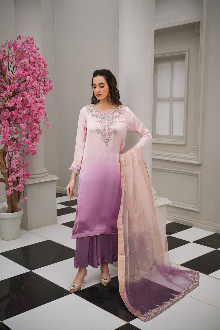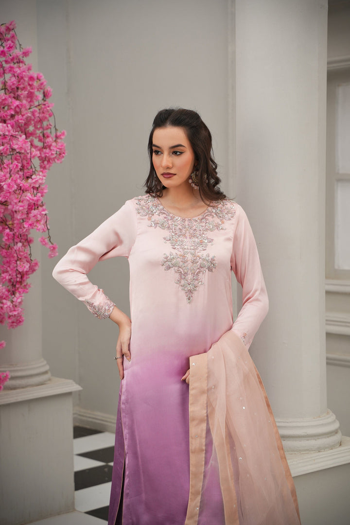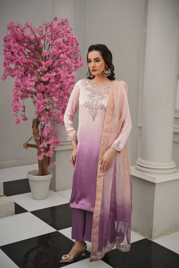 The Satin Silk shirt and trousers, in a soft ombre blend of lilac and pink, create a luxurious, flowing silhouette that radiates elegance. Paired with a Lilac and Pink double-tone Organza dupatta, this outfit captures a dreamy charm with refined craftsmanship.