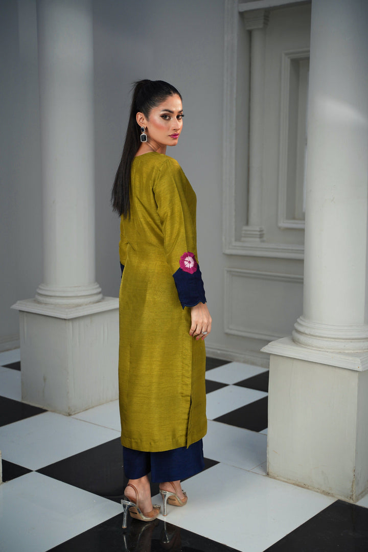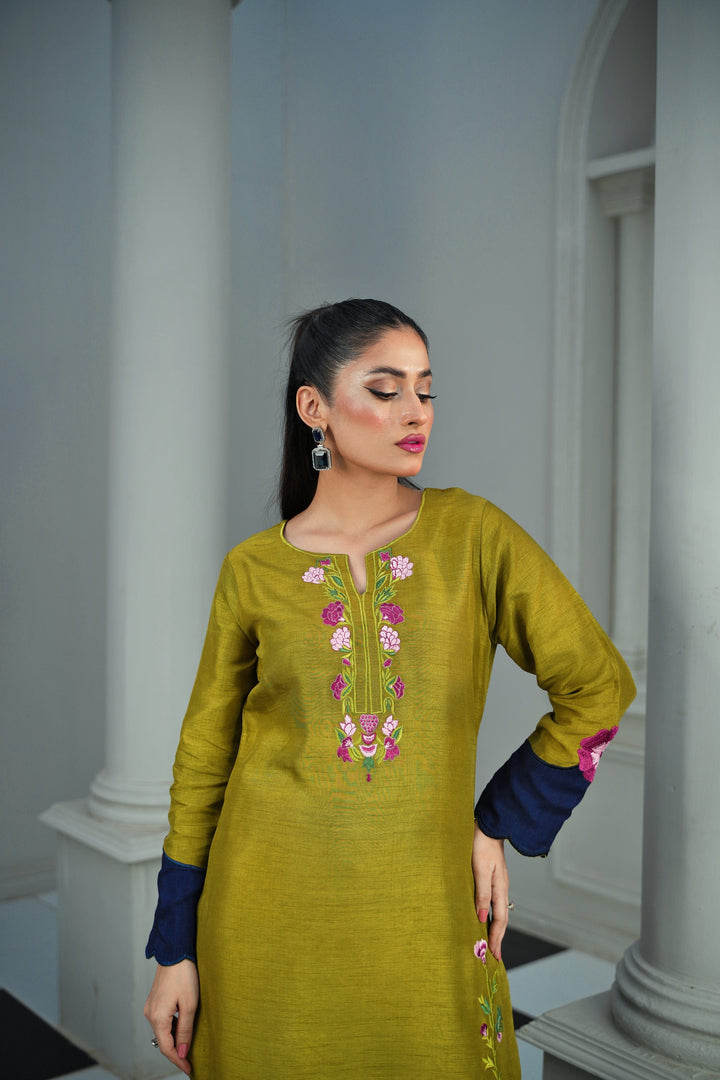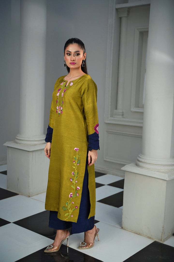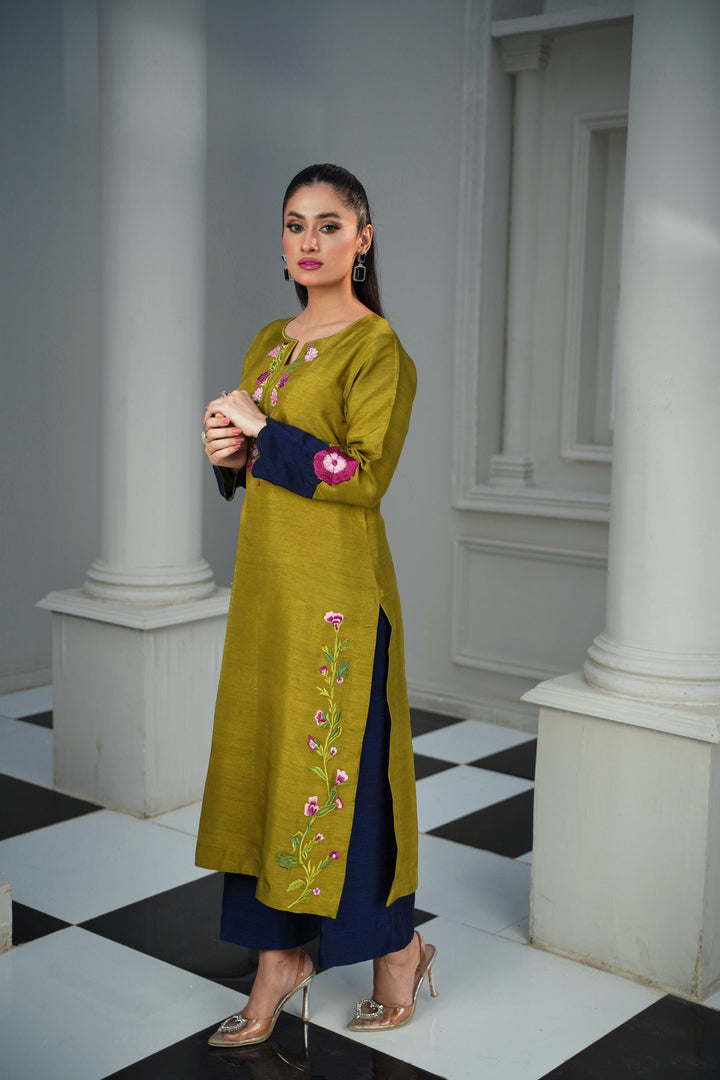 Adorned with delicate silk thread embellishments, this vibrant Sage Green ensemble radiates charm and elegance. The Korean Raw Silk Sage Green shirt showcases fine craftsmanship and a smooth, luxurious finish, beautifully paired with Blue Korean Raw Silk trousers that create a graceful contrast.