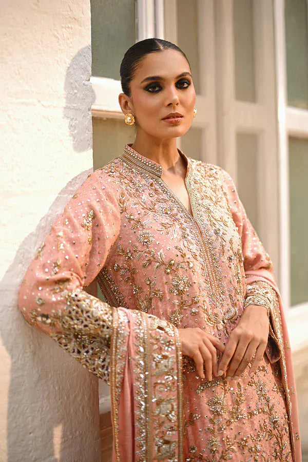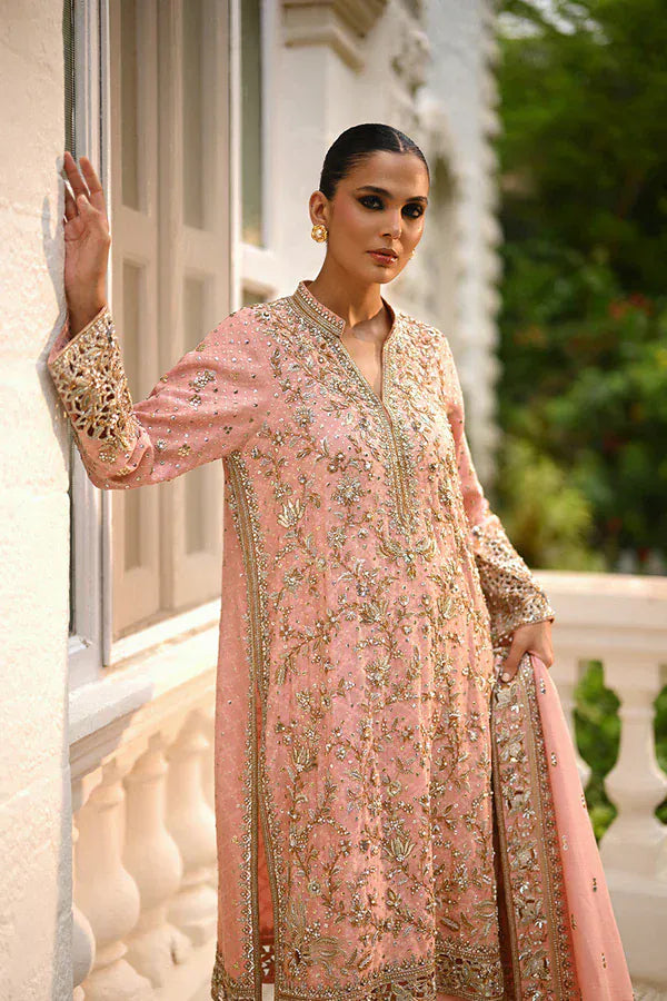 A delicate embrace of peach tones, lit with golden shimmer. The straight cut kurta crafted from cotton net is meticulously embroidered with zardoze, sequins, kamdani, and beadwork, its neckline, sleeves, and hem brought to life with gleaming lattice cutwork along the borders and side slits. Paired with tailored pure raw silk culottes embroidered with motifs at the hem, the look finds harmony in detail and restraint. A cotton net dupatta, edged with sparkling kamdani borders and scattered embellishments, floats weightlessly to lend a radiant finish to the ensemble.