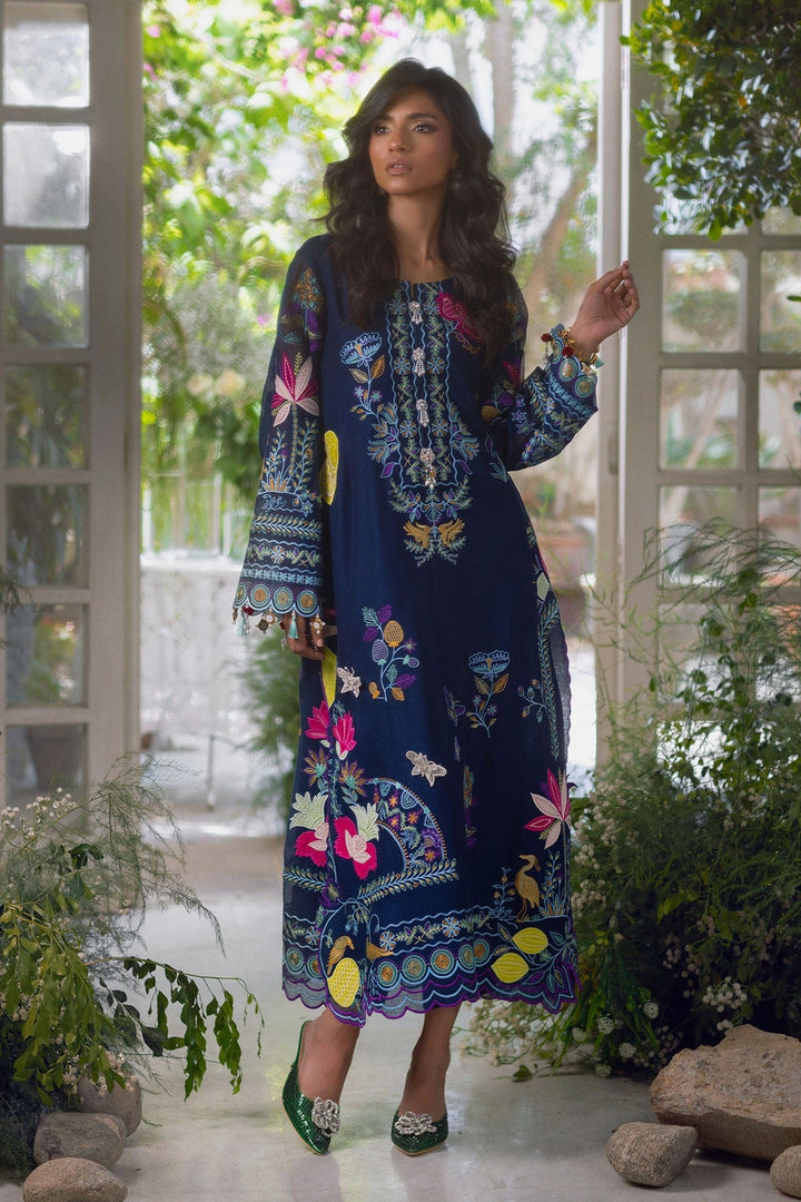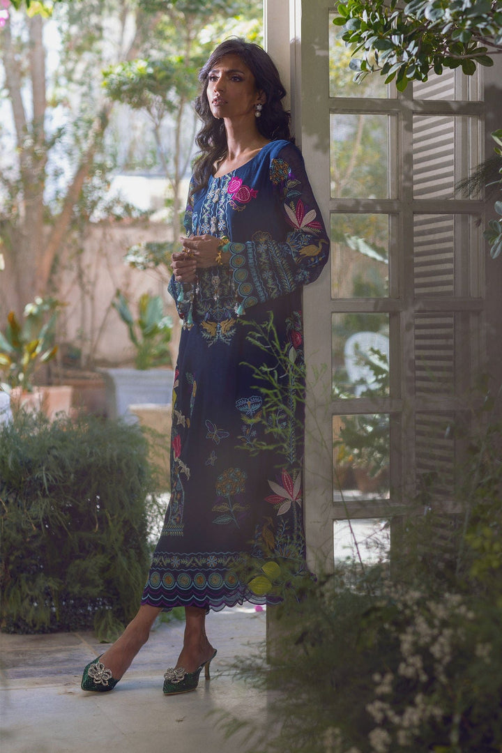 Long silhouette shirt in a rich midnight blue on pure silk net, showcasing an exquisite array of embroidery and meticulously hand-embellished details. The center front is elegantly adorned with appliqué designs in a captivating pattern. The sleeves are embellished with handcrafted tassels, and the shirt is accompanied by straight matching raw silk pants to enhance the overall aesthetic.