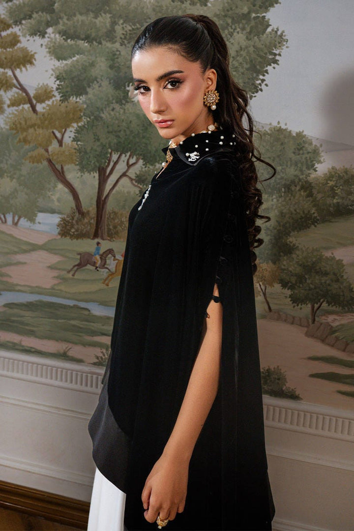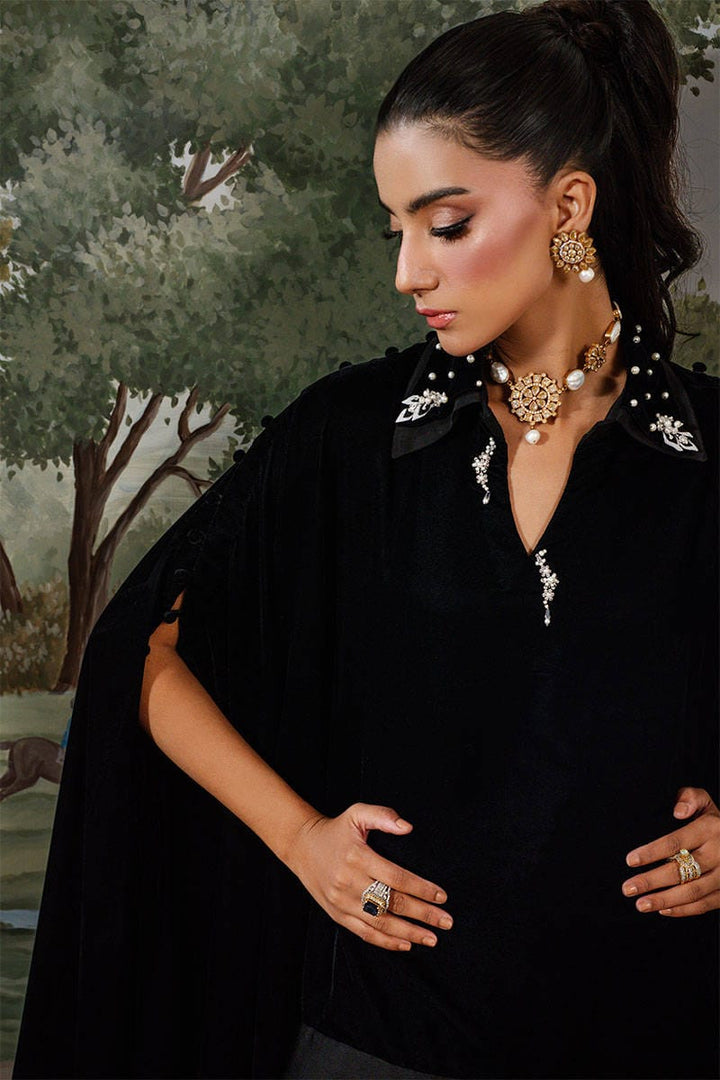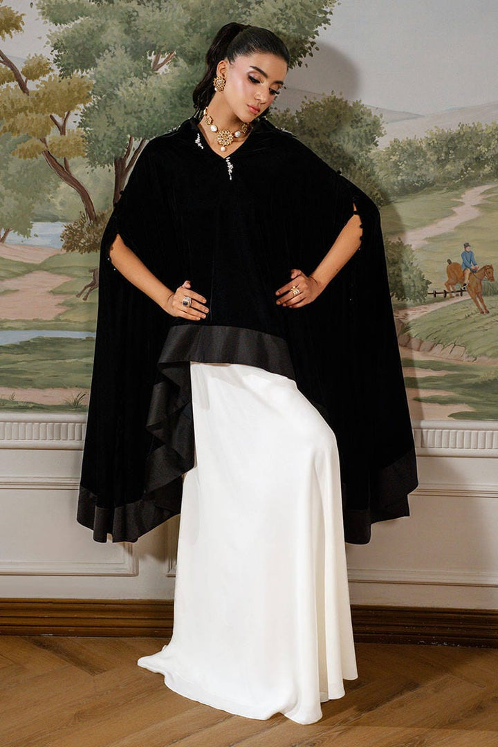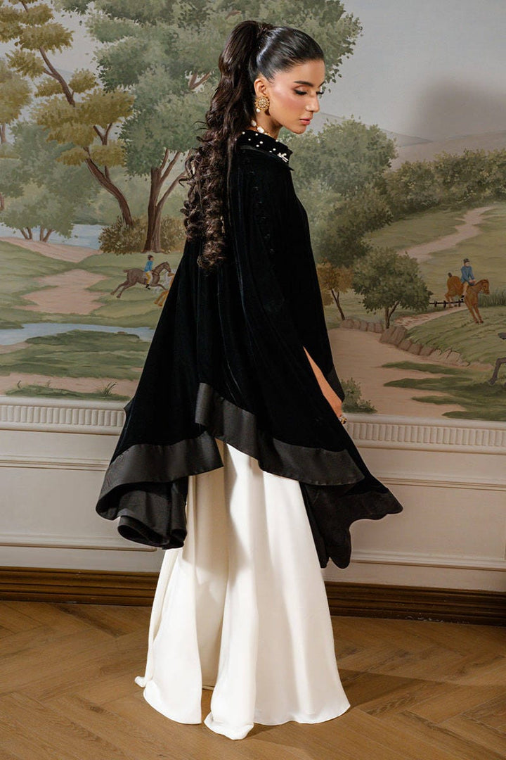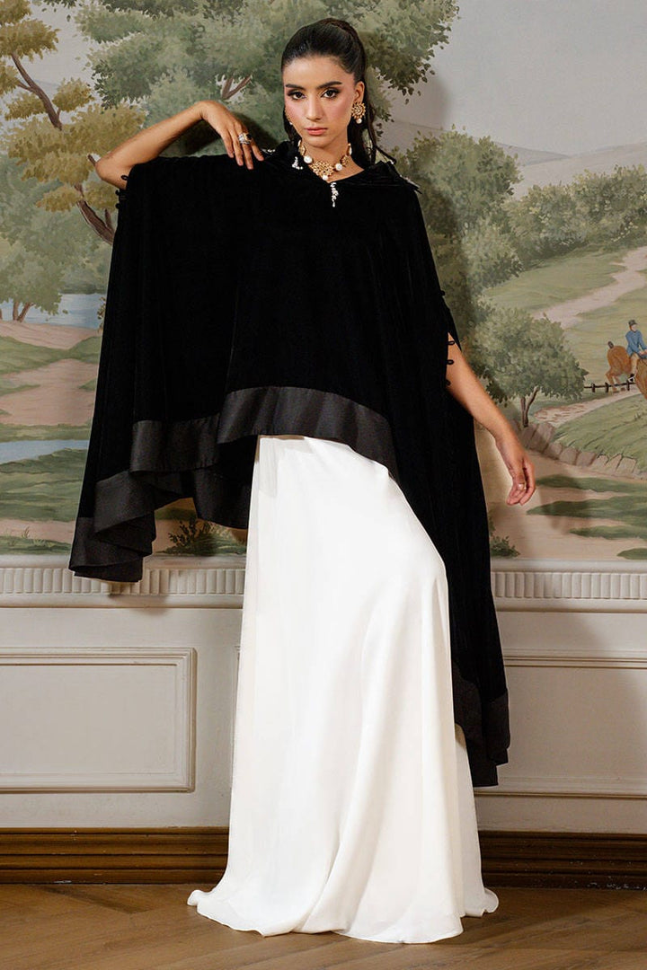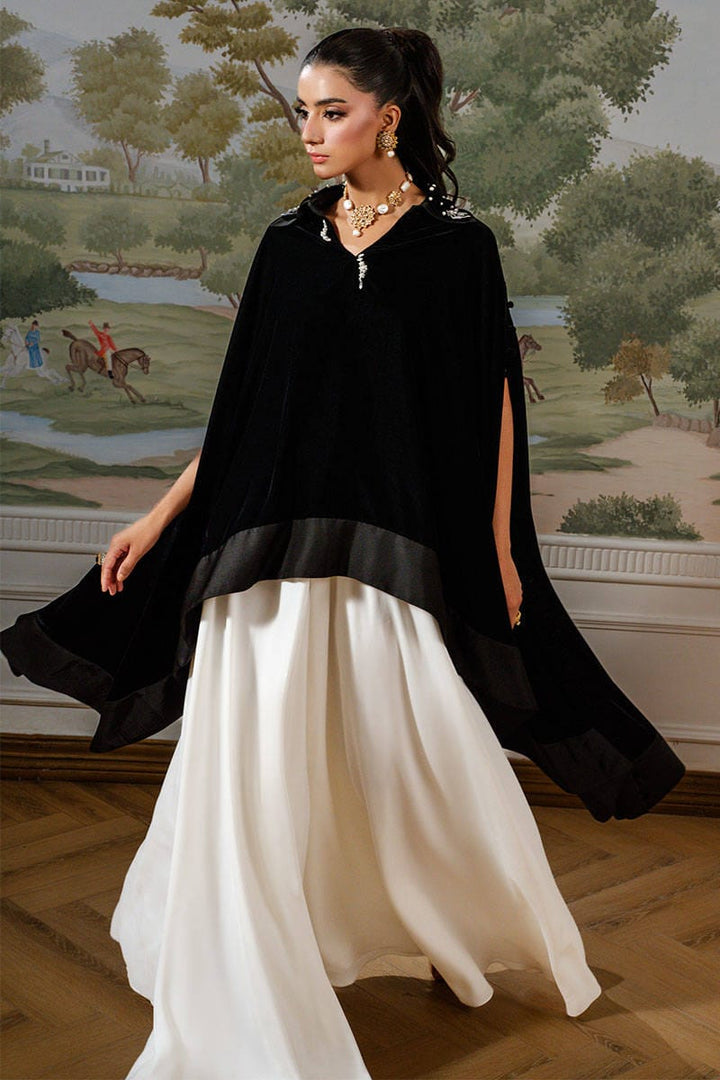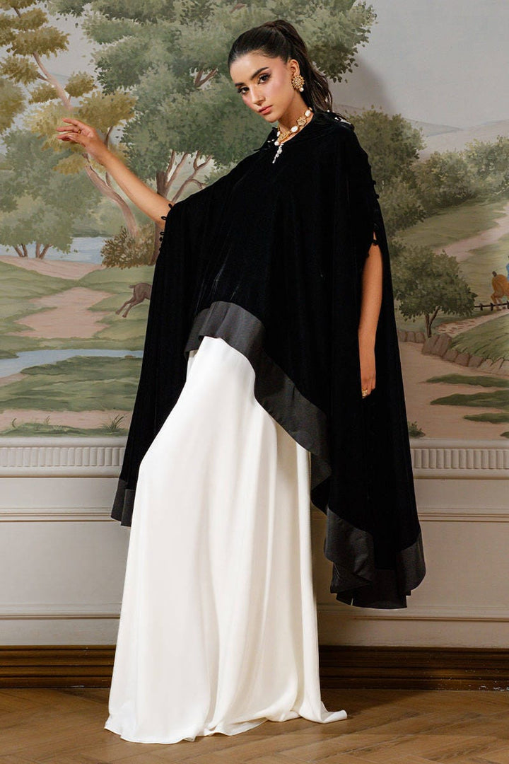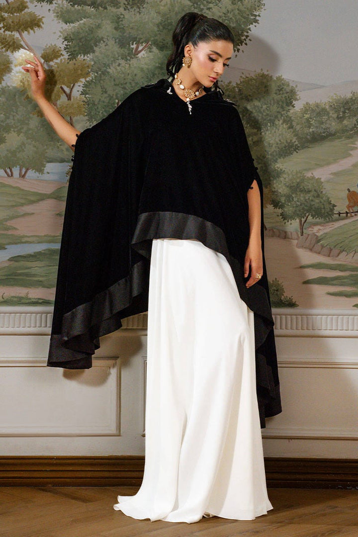 A statement black cape featuring intricate hand-embellished detailing along the collar and elegant loop-button accents running down the sleeves. Paired with Zainab Salmanās signature white Bambi pants, this look exudes effortless sophistication while maintaining a touch of modern drama.