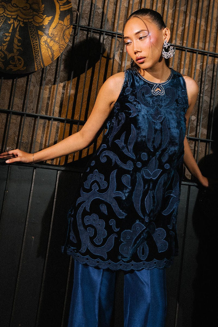 A striking navy blue halter-neck velvet shirt featuring delicate organza appliqué and an eye-catching heart-shaped cutout at the neckline, accentuated with sparkling Swarovski stones for a touch of glamour. Paired with chic boot-cut pants adorned with organza detailing at the hem, this ensemble blends bold design with refined elegance—perfect for making a stylish statement at any evening event.