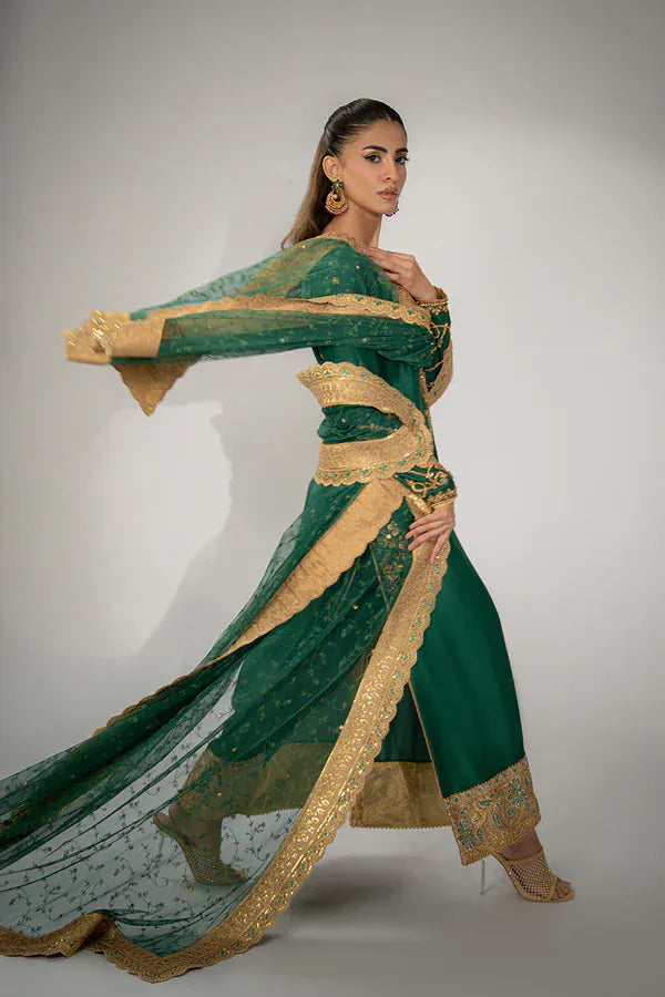 Regal sophistication defines this breathtaking emerald green ensemble, a classic piece from the Mina Hasan Luxury Pret collection. The long raw silk kurta features a richly decorated neckline and sleeves, meticulously worked with heavy antique gold zari and dabka embroidery that embodies traditional luxury. Finished with a magnificent zari-bordered hemline and paired with a coordinating sheer dupatta featuring scattered motifs, this outfit ensures a look of timeless, majestic elegance for any wedding occasion.