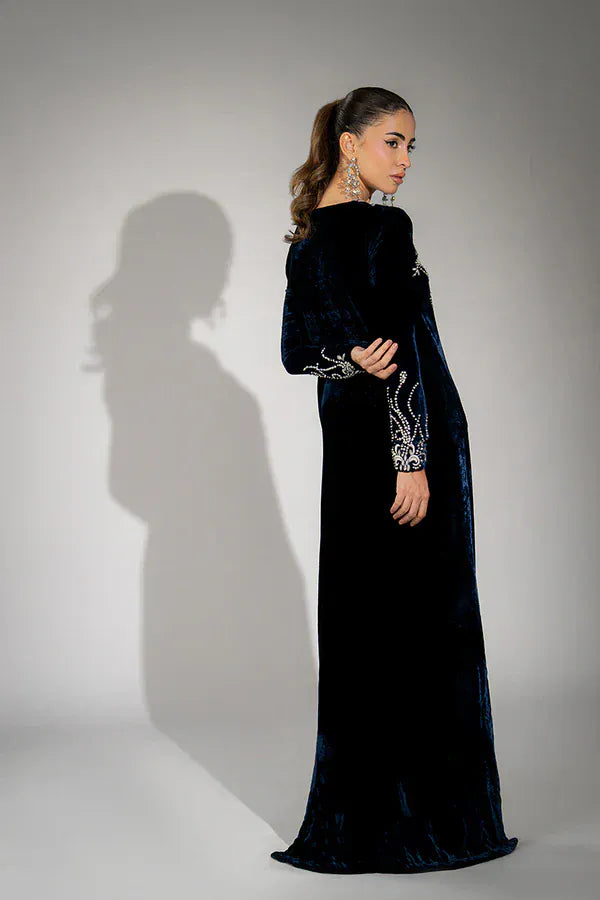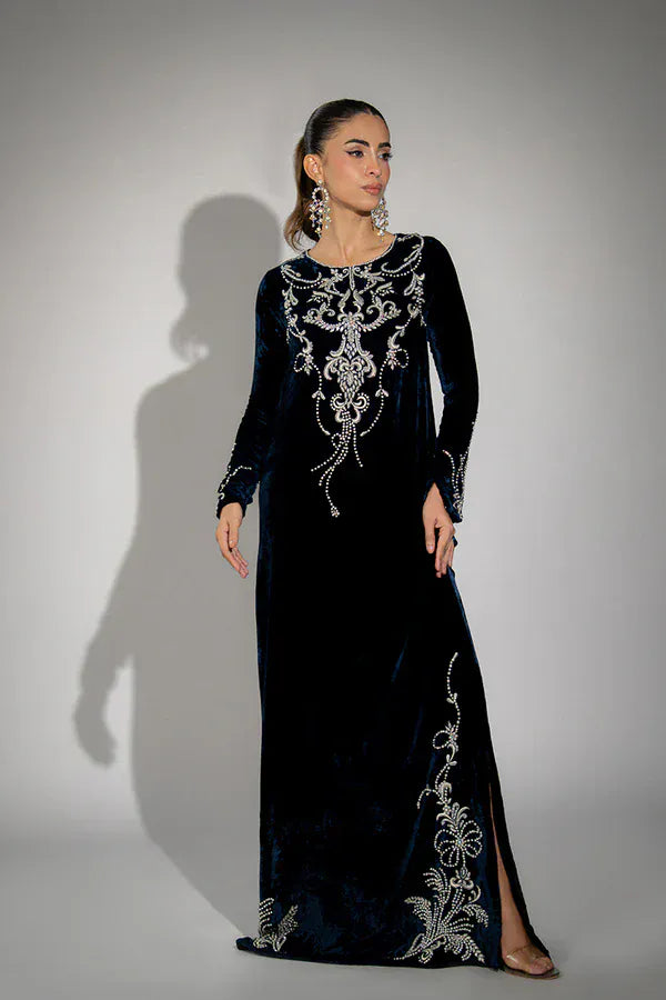 Command attention in this breathtaking black velvet long dress, a luxurious garment designed for ultimate evening sophistication. The deep, plush fabric serves as the perfect canvas for the exquisite silver dabka and crystal hand-embellishments, which elegantly frame the neckline and trail down the front in a stunning motif. With a flattering, full-length silhouette and a subtle side slit adorned with matching embroidery, this piece promises a look of timeless, redefined glamour at any grand affair.