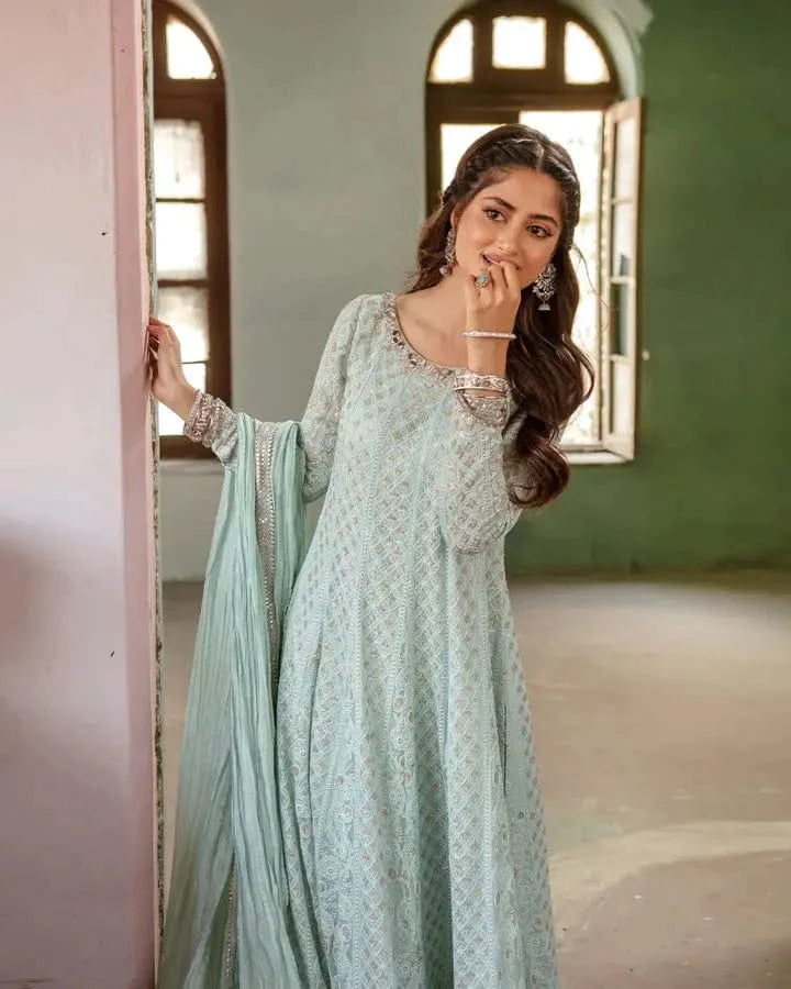 Description: A three piece kalidaar designed out of a sumptuously embroidered fabric featuring mosaic like silver embellishments on the shirt and culottes. It comes paired with a lace detailed crushed dupatta.