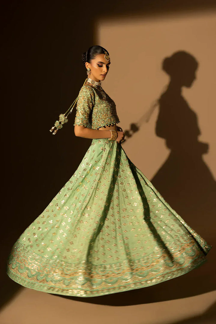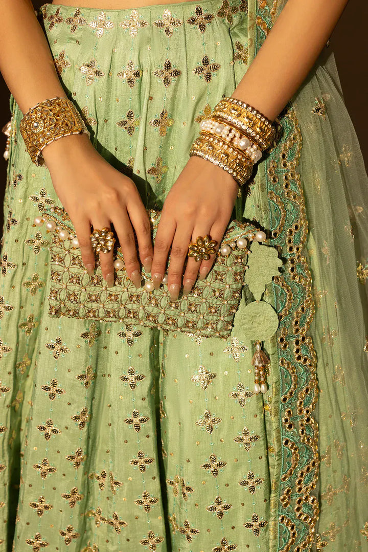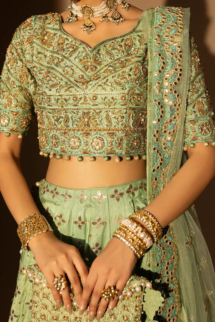 As rare as her name, Nayab gleams in the freshness of mint and gold. The lehnga choli is a masterpiece of handcrafted splendor — adorned with pearls that shimmer like dewdrops at dawn. Every motif is meticulously composed, creating a balance between regal ornamentation and serene charm. Nayab is grace refined — ethereal, radiant, and eternally unforgettable.