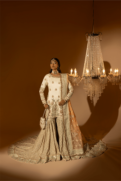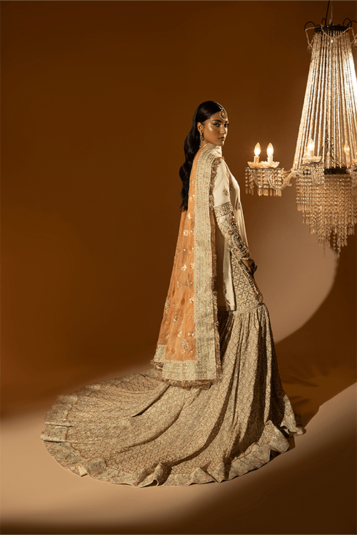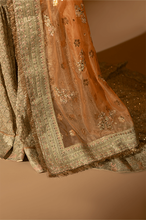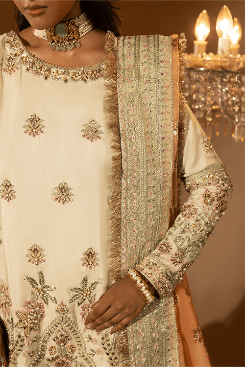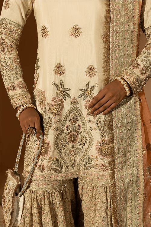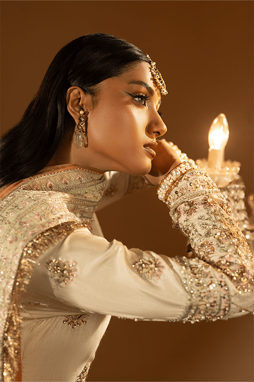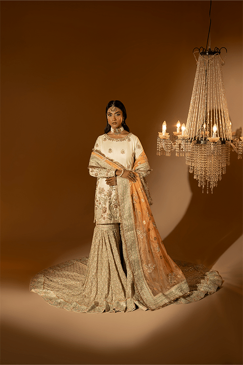 A striking black-gold design with a pure zari tissue shirt layered over a silk camisole, paired with a printed raw silk trouser and an organza dupatta. The bold cut is elevated with embroidery and fine handwork in beads, stones, pearls, gota, dabka and naqshi, making it a perfect statement piece.