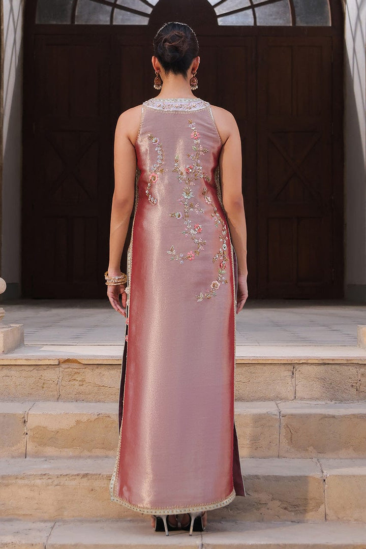 A champagne pink vision in tissue, this sleeveless column shirt embodies quiet grandeur in every detail. The lustrous surface shimmers with appliqué and fine zardoze embroidery framing the neckline in precise symmetry, while antique gold, pistachio, ivory and blush florals unfurl across the fabric. Subtle sequins and beads catch the light, adding a gentle luminosity. Paired with matching brocade trousers richly adorned with cutwork zardoze, the ensemble strikes a harmonious balance between ornate artistry and streamlined silhouette.
