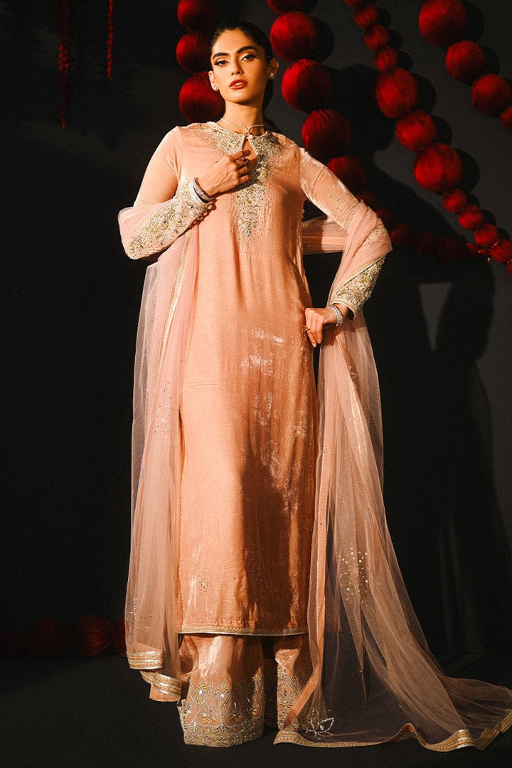 This powder pink velvet ensemble radiates timeless elegance with its embellished keyhole neckline, fitted embellished sleeves, and loop button details along the side vent. The back features organza panels with intricate embellishments, adding a graceful twist. Paired with embellished velvet Dhaka pants and a net dupatta adorned with Swarovski stone flower details, this look beautifully blends luxury, femininity, and modern charm.