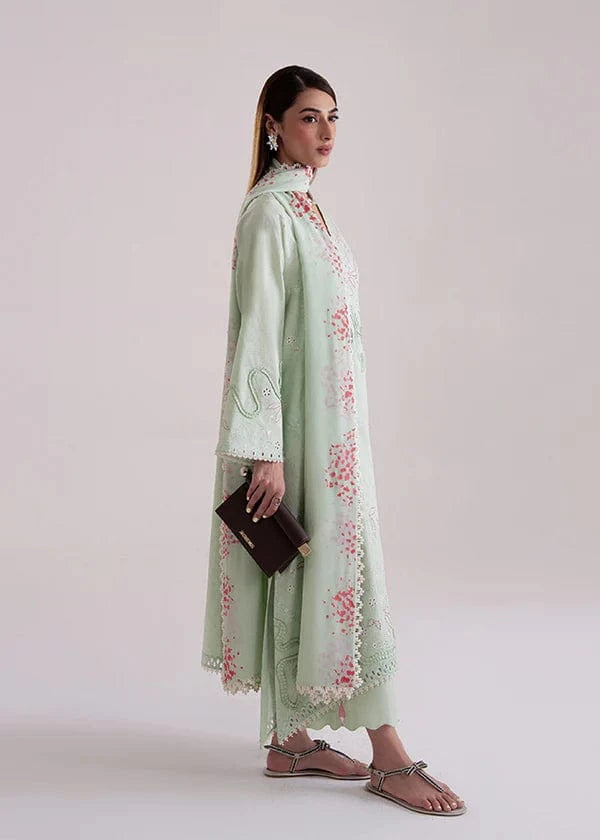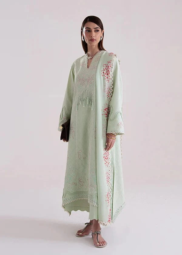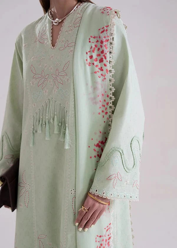 Mint Green drop-corner jacquard lawn shirt with a slight V neckline. Features geometric floral embroidery with curtain-like tassels, floral boring on hem, and bell sleeves with winding stitch details for contrast.