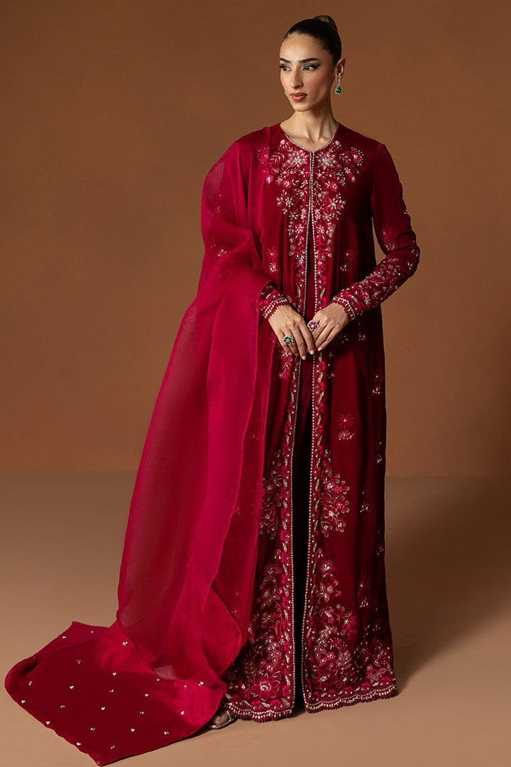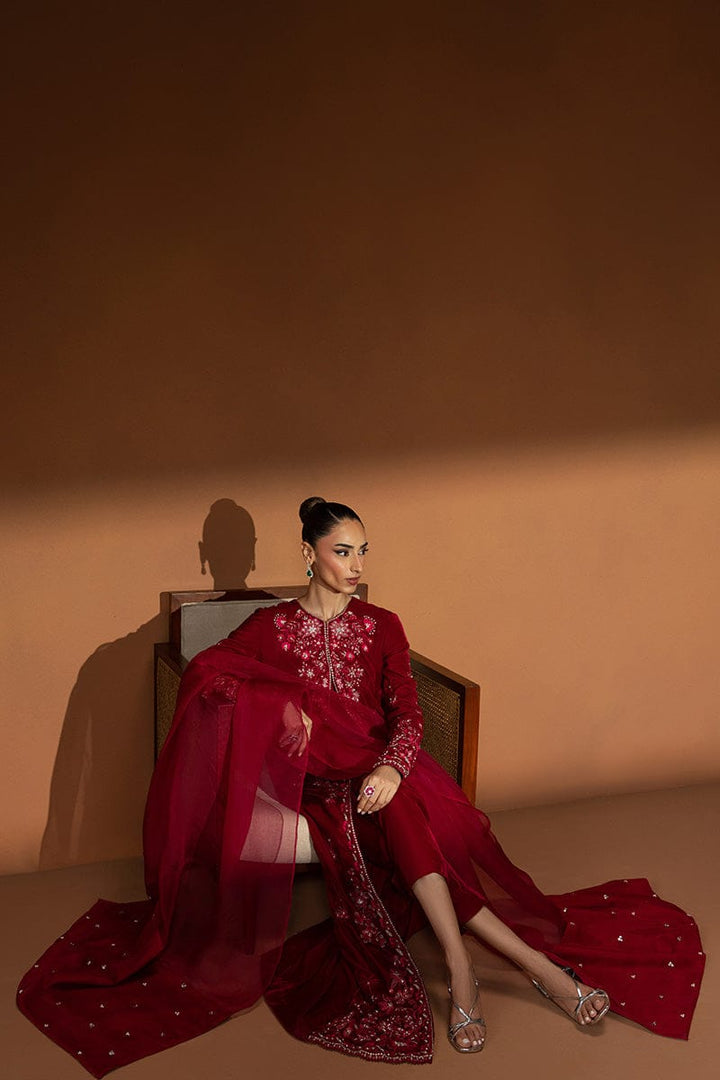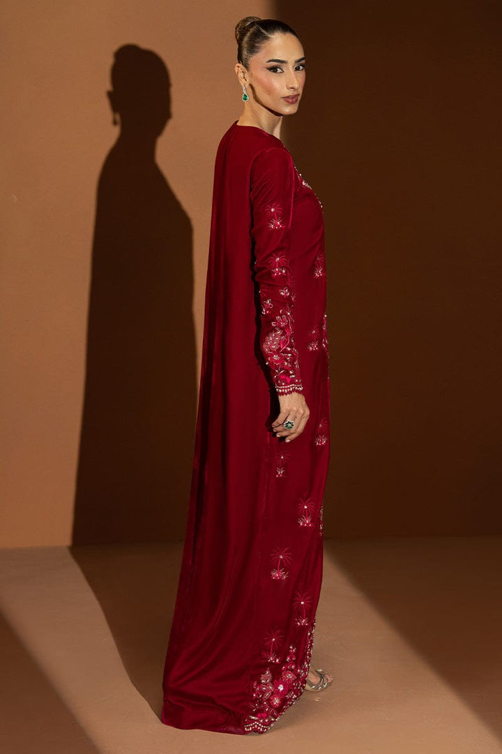 Rendered in a rich wine hue, Opal is a full-length, front-open velvet gown adorned with intricate embellishments along the front and cuffs, glistening with delicate detailing. Paired with sleek cigarette pants, this look is effortlessly sophisticated—a perfect choice to embrace the warmth and grace of winter festivities.